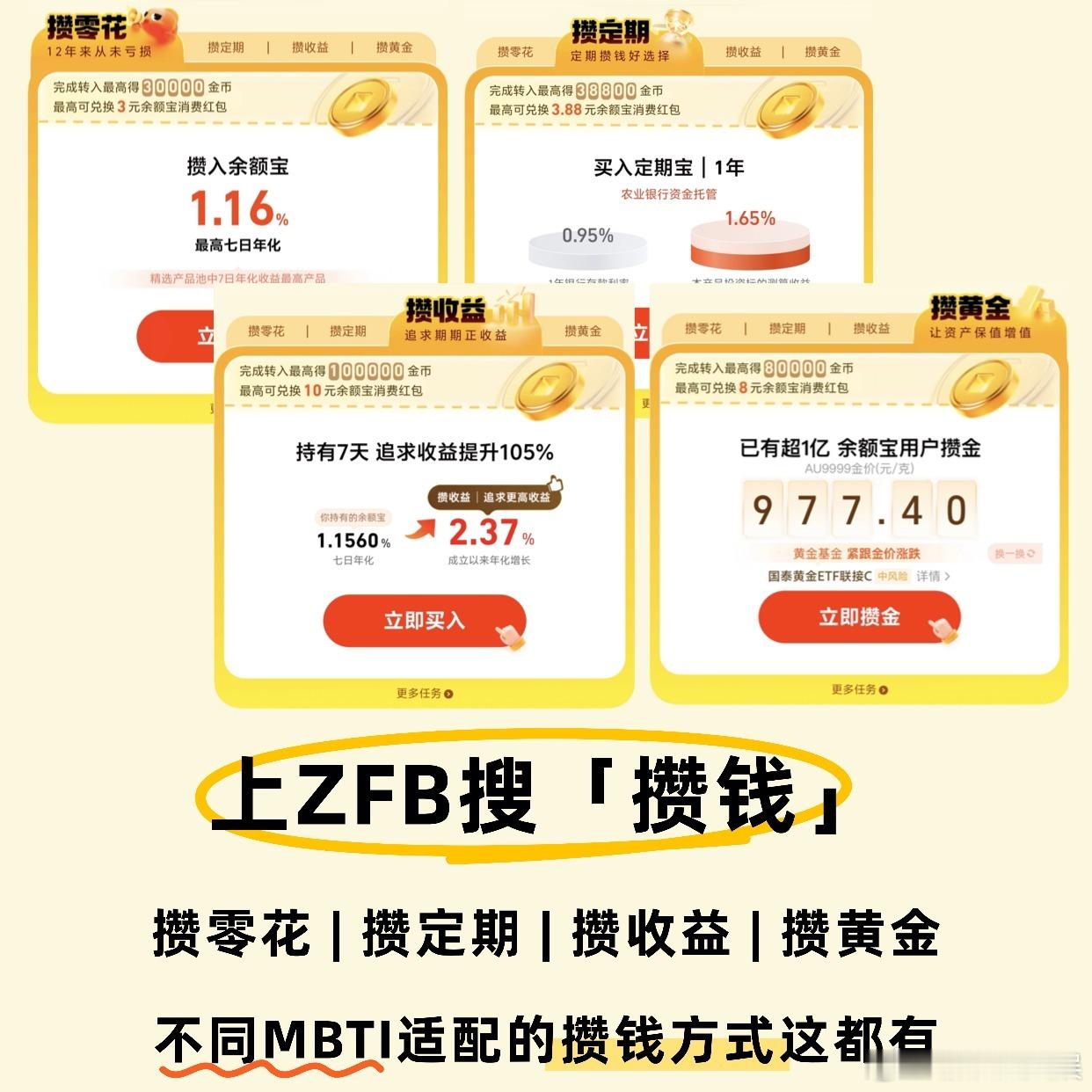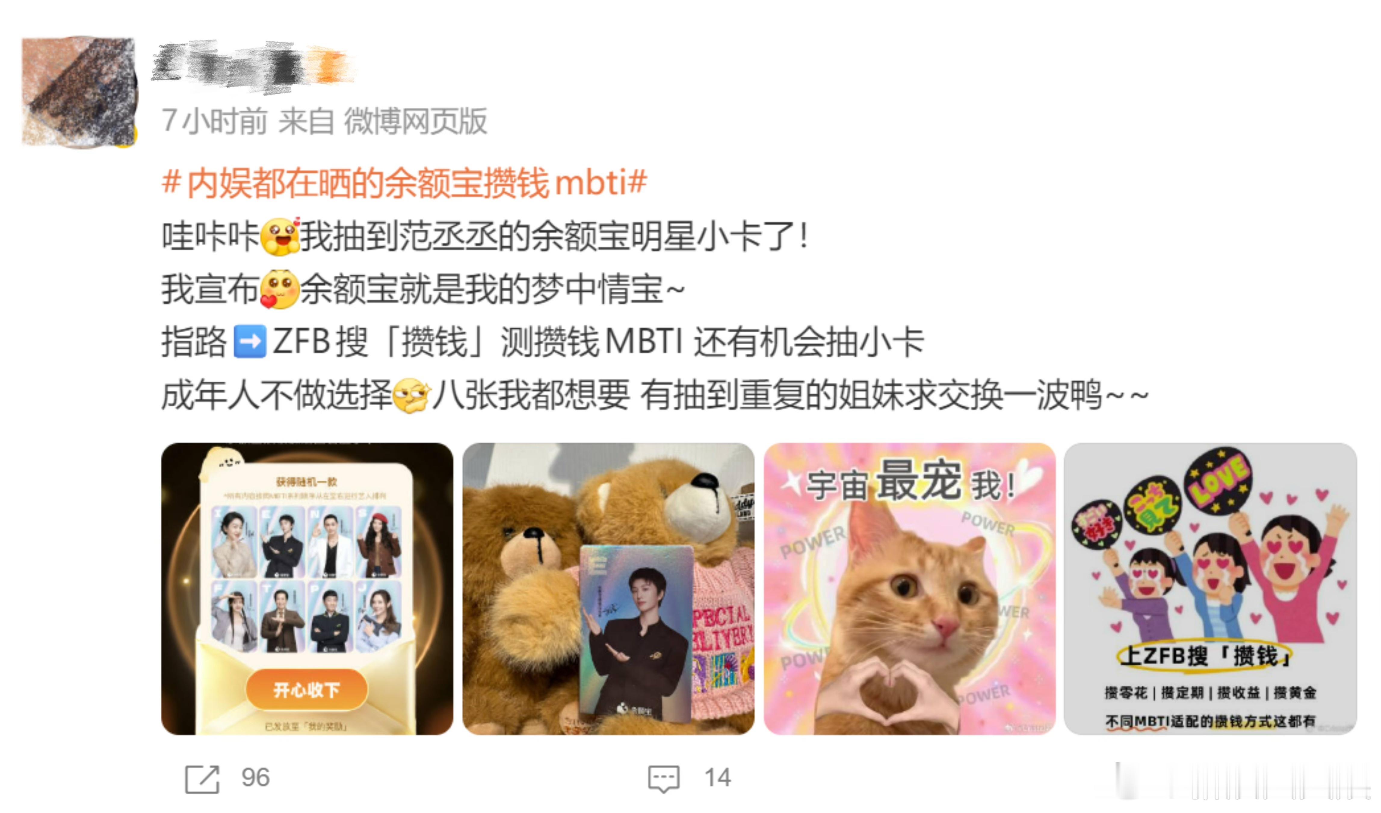 起猛了大家都在晒余额宝全明星小卡 你们的嘴怎么都这么严啊?出明星小卡了也不通知我一声?余额宝攒钱加油团,全明星阵容竟然还挺豪华!八个明星,八种攒钱性格,果然不同MBTI适配的攒钱方式都在余额宝看你们都在晒小卡,甚至有人马上都要集齐八张了,收集星人的DNA动了!听说上ZFB搜「攒钱」测攒钱MBTI ,就有机会抽小卡,还能GET明星同款攒钱法,成年人不做选择,说实话我都想要…
