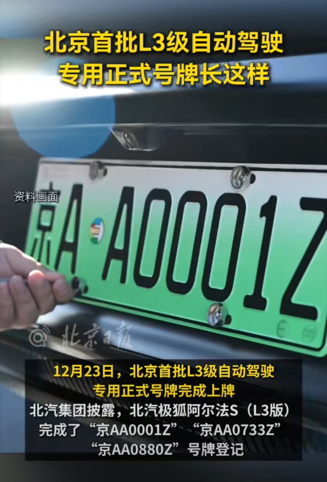 L3级自动驾驶专用正式号牌来了首批L3自动驾驶车型:重庆:渝AD0001Z(长安深蓝)北京:京AA0001Z、京AA0733Z、京AA0880Z(北汽极狐)首批L3高速专用号牌什么样 有没有发现车牌的最后一位“Z”,也就是自动驾驶的简称。