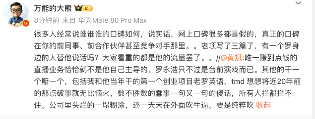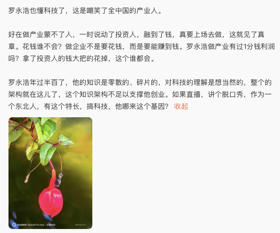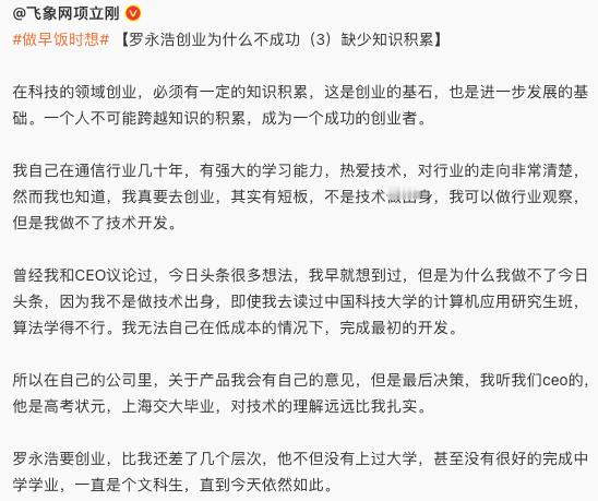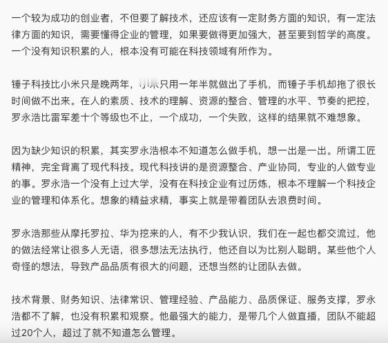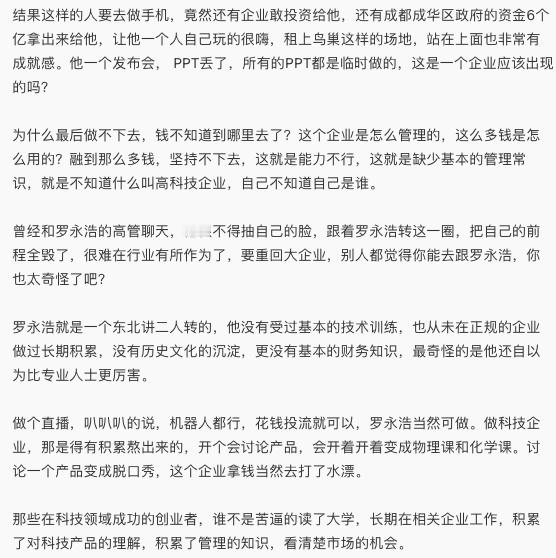 项立刚项总这是火力全开啊,又是一个大长篇:【罗永浩创业为什么不成功(3)缺少知识积累】,这么直接,这么直白地分析。其中一句话:罗永浩也懂科技了,这是嘲笑了全中国的产业人。还有两看看两位大V的评论。这是要炸锅了。。
