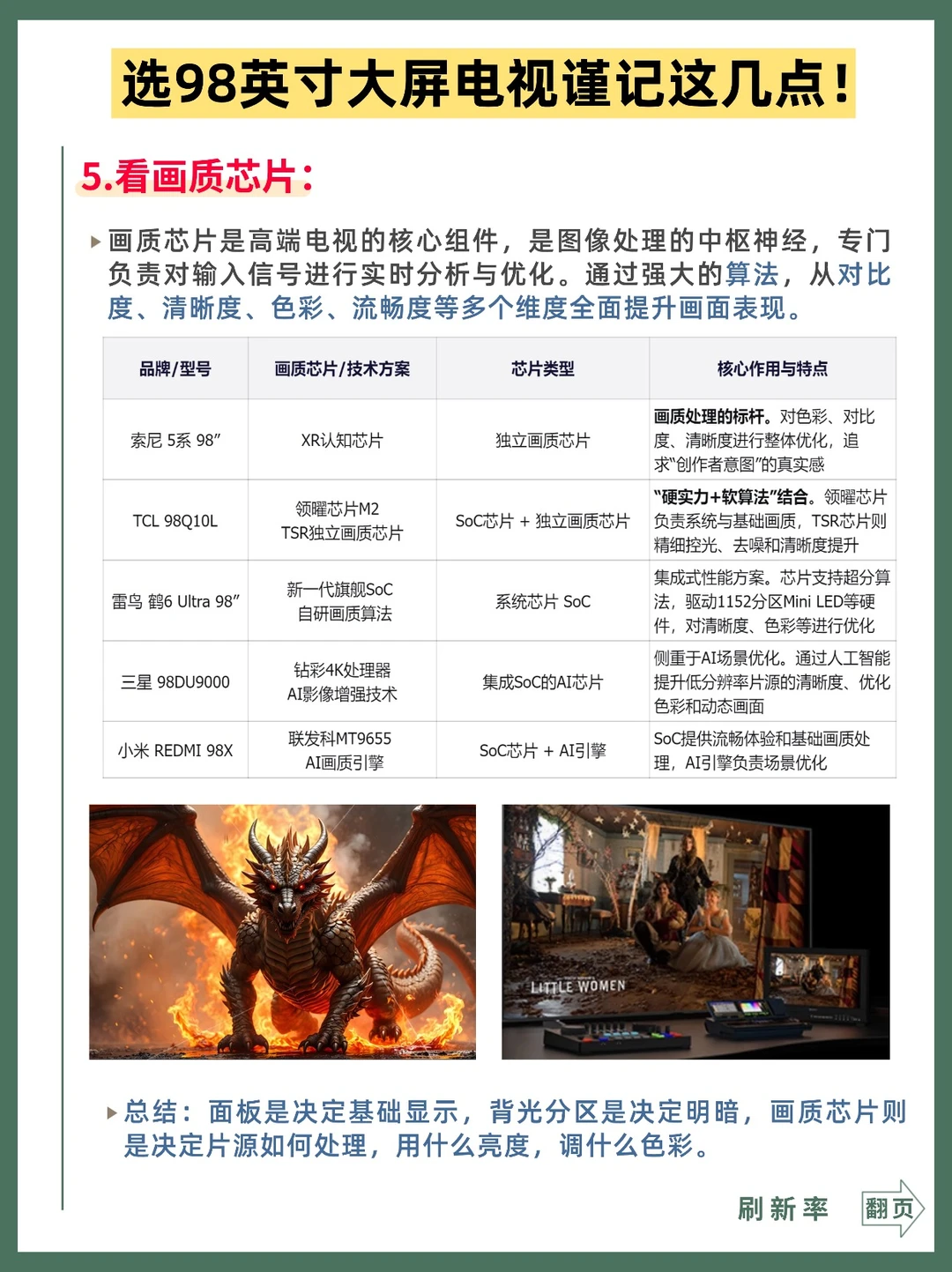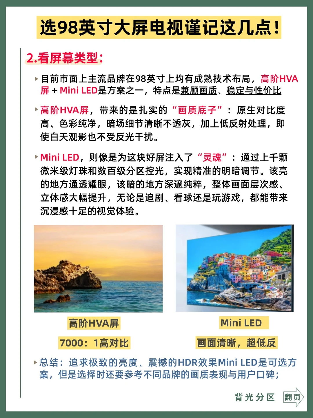 目前市面上主流品牌在98英寸上均有成熟技术布局。像MiniLED、HVA等技术,在98英寸上调配得非常成熟,色彩、对比度和细节表现都很扎实。