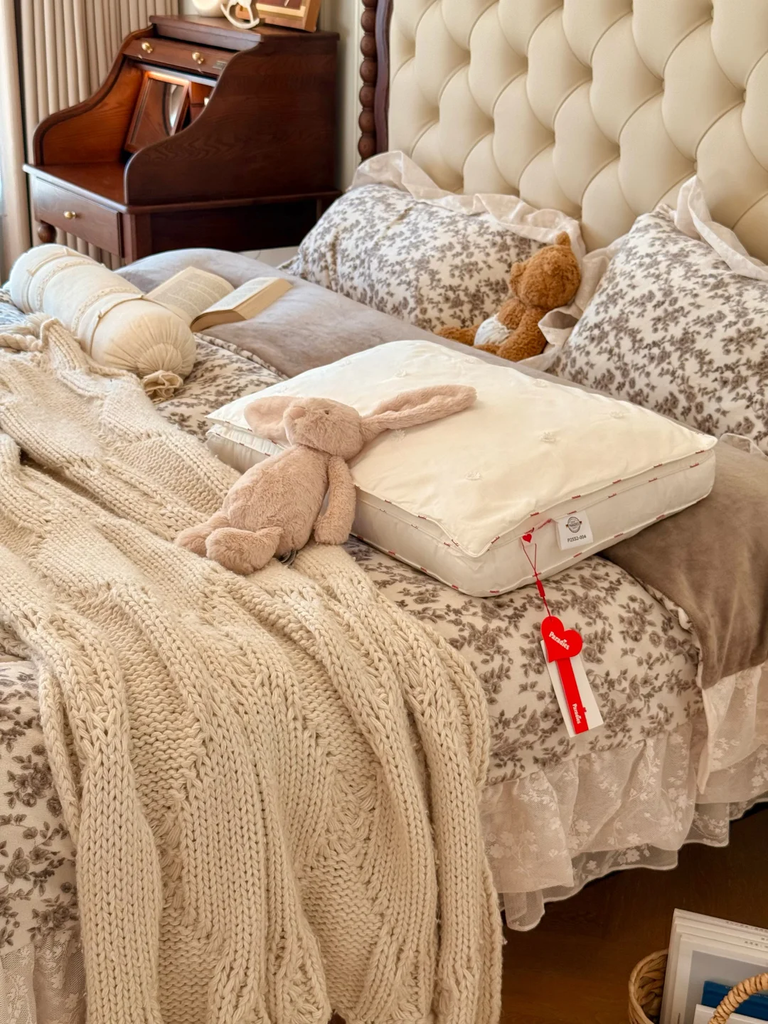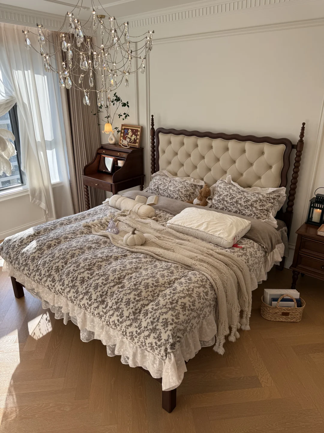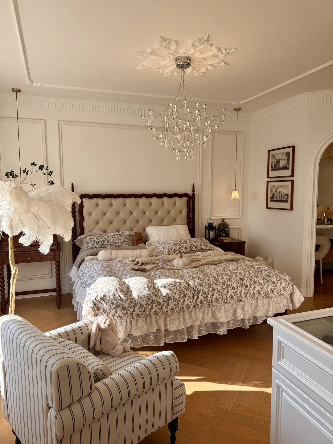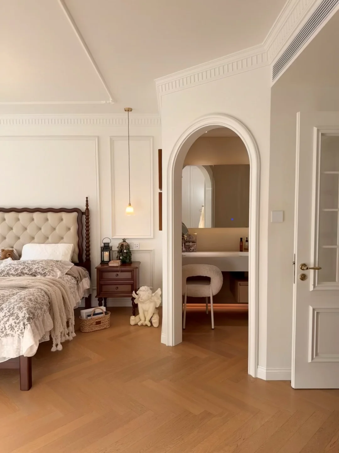 🖇️地面铺的是人字拼木地板,暖棕色的木纹顺着一个方向铺,踩上去软软的,比瓷砖温馨多了。最点睛的是实木线条,沿着墙面顶角、床头背景墙走了一圈,没做复杂的雕花,简单的线条就把法式的精致感拉满了,还不显得压抑
