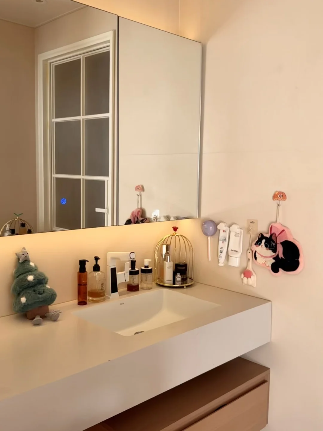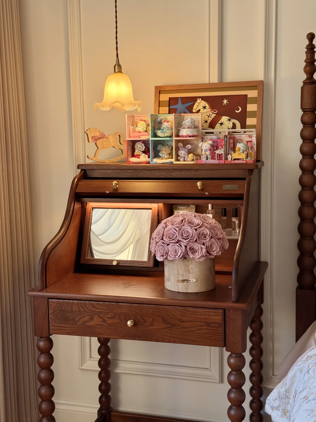 🖇️家具特意挑了胡桃木色,和浅色系撞在一起,暖乎乎的不单调。床是巢趣的夏克床,简约的设计,靠背软乎乎的,晚上靠在上面看书特别舒服。床边放了个风琴梳妆柜,抽屉多到能装下我所有的护肤品和化妆品,柜门打开像风琴一样,颜值还高,朋友来参观都问链接