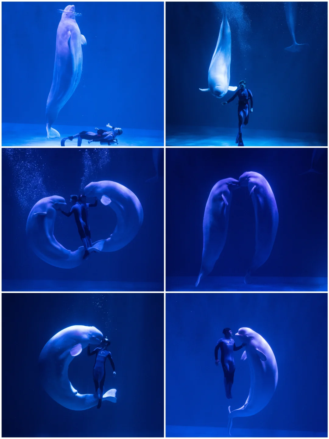 全球首创的💙海洋之心💙水下拥吻真的太太太震撼了!白鲸跟着保育师旋转、游弋,画面唯美到失语,小丸子全程瞪大眼睛,连大气都不敢喘。