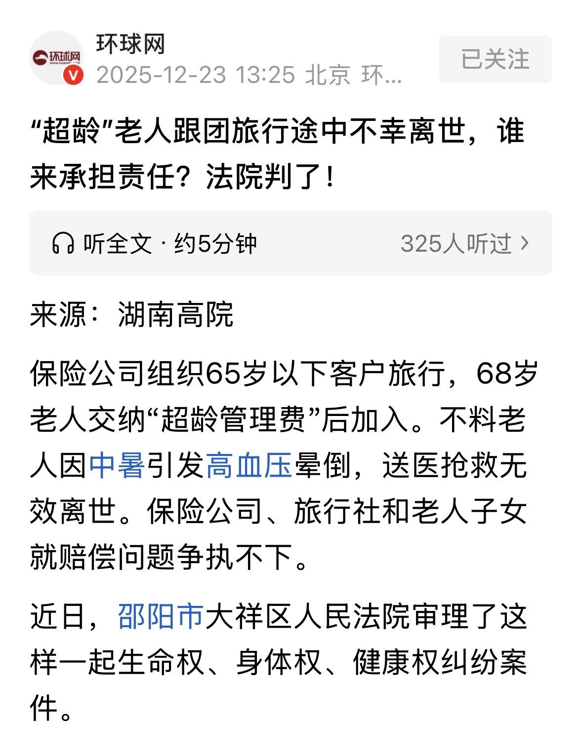 湖南邵阳,68岁男子参加保险公司组织的旅行,并交了800块超龄费,到了第4天,他们起个大早,爬山、购物,晚上又逛夜市,行程满满,等回到酒店,男子因中暑引发高血压晕倒在地,最终抢救无效离世。家属把保险公司和旅行社诉至法院,索赔80万,法院这样判。 2024年10月,68岁的王某参加了保险公司为了回馈客户,安排的免费云南西双版纳之旅。 不过,组织这次旅行的旅行社有个规矩,超过65岁的老人,得多交800块钱,说是“超龄费”。 王某掏了这800块,成了团里的一员。 这趟旅程的头3天,看山看水逛景点,行程安排的还算合理。 可到了第4天,行程突然排得特别满当。 一大清早,不到7点半,大伙儿就被拉去逛商场购物,紧接着又是爬山看风景。晚上也没闲着,安排了篝火晚会,之后还去夜市逛了一圈。 等这一大圈折腾下来,回到酒店的时候,已经是深夜10点20分左右了。 连续几天早出晚归,加上这一天的密集活动,年轻人都觉得累,更何况是上了年纪的老人。 王某拖着疲惫的身子,跟着同伴们走到酒店电梯口,等着上楼回房间。 就在这时,王某突然感觉极度不适,紧接着就是一阵剧烈的呕吐,随即整个人失去意识,重重晕倒在地。 同行的团友和工作人员都吓坏了,赶紧冲上去帮忙,七手八脚地把老人紧急送往附近的医院抢救。 可惜,王某最终还是因为急性呼吸循环衰竭死亡。同时,他本身被查出有高血压等基础疾病。 噩耗传来,王某的子女悲痛欲绝,觉得这事儿保险公司和旅行社脱不了干系。 首先,父亲68岁了,旅行社既然收了那800块“超龄费”,不就等于承认了老人参团有额外风险吗? 那他们就更应该对老人的身体状况严格把关,或者至少得详细问问、提醒提醒吧? 结果从头到尾,根本没人认真问过老爷子身体咋样,有啥病没有,能不能扛得住这么累的行程。 其次,看看这第4天的安排,大清早就把人拉出去,一直搞到深更半夜,中间又是购物又是爬山又是晚会又是逛夜市,强度太大了,别说老人,年轻人都够呛! 他们认定,就是这紧张密集的行程,把父亲身体里的隐患给引爆了,最终导致了这场悲剧。 于是,他们将保险公司和旅行社一起告上了法庭,要求两家连带赔偿包括死亡赔偿金、丧葬费、精神损失费等等在内,总计80万元。 然而,保险公司和旅行社辩解,这完全是意外。王某是因为自己本身就有病,突然发作才走的,跟旅游活动没啥直接关系。 而且,王某自己报名的时候也没主动说身体不好啊?行程中也没见他喊不舒服。 出事后,他们该送的医院也送了,该配合的也配合了,算是尽到救助义务了。 所以,老人的死,怪不到他们头上。他们觉得家属要求的80万赔偿太高了,不合理。 《旅游法》第80条规定:旅游经营者应当就旅游活动中的必要安全防范、应急措施及不适宜参加相关活动的群体等事项,以明示方式事先向旅游者作出说明或警示。 法官认为,既然收了800块钱“超龄费”,旅行社就有义务详细问过王某的身体状况,并充分告知行程中的各种风险和注意事项。但旅行社没有。 再看看第四天那安排得满满当当、从早到晚的行程,连轴转下来,对老年人的身体负担确实太重了。 法官认为,旅行社在保障老人安全这方面,工作没做到位,存在明显的疏忽和过错。和王某的死存在关联。 法官斟酌后定旅行社需承担25%的责任。 接着是策划和组织这次旅行的保险公司。 法官认为,作为活动发起方,他们知道王某是高龄老人,有责任提前问王某能不能适应旅途劳顿。 还有,整个行程的安排是不是合理,也应该提前审查把关一下吧? 由于保险公司同样没拿出任何证据证明他们做了这些该做的事。因此,保险公司也存在一定的过错,也需要负责,比例定为15%。 最后,法官的目光落在了王某老人自己身上。 王某是个有完全行为能力的成年人,他自己最清楚自己的身体。他知道自己有高血压这些老毛病。 在报名参加这种长途旅行团时,尤其是在被收取了“超龄费”的情况下,他理应主动、如实地向组织方说明自己的健康状况,评估一下风险。 而且,在行程中,他自己也是最直接感受身体变化的人,如果感觉撑不住了,也该及时提出休息或就医。 因此,王某自己作为自身健康和安全的第一责任人,对这次不幸的死亡结果,要承担最主要的责任,比例定为60%。 经过严格的核算,法院最终认定王某去世造成的全部损失,加起来一共是69.15万元。 旅行社赔偿约17.29万,保险公司赔偿约10.37万。 王某及其家属自行承担剩余41.49万。 判决书下来后,双方都没有再上诉。 对此,你怎么看? 关注@运良说法 学法律知识不迷路