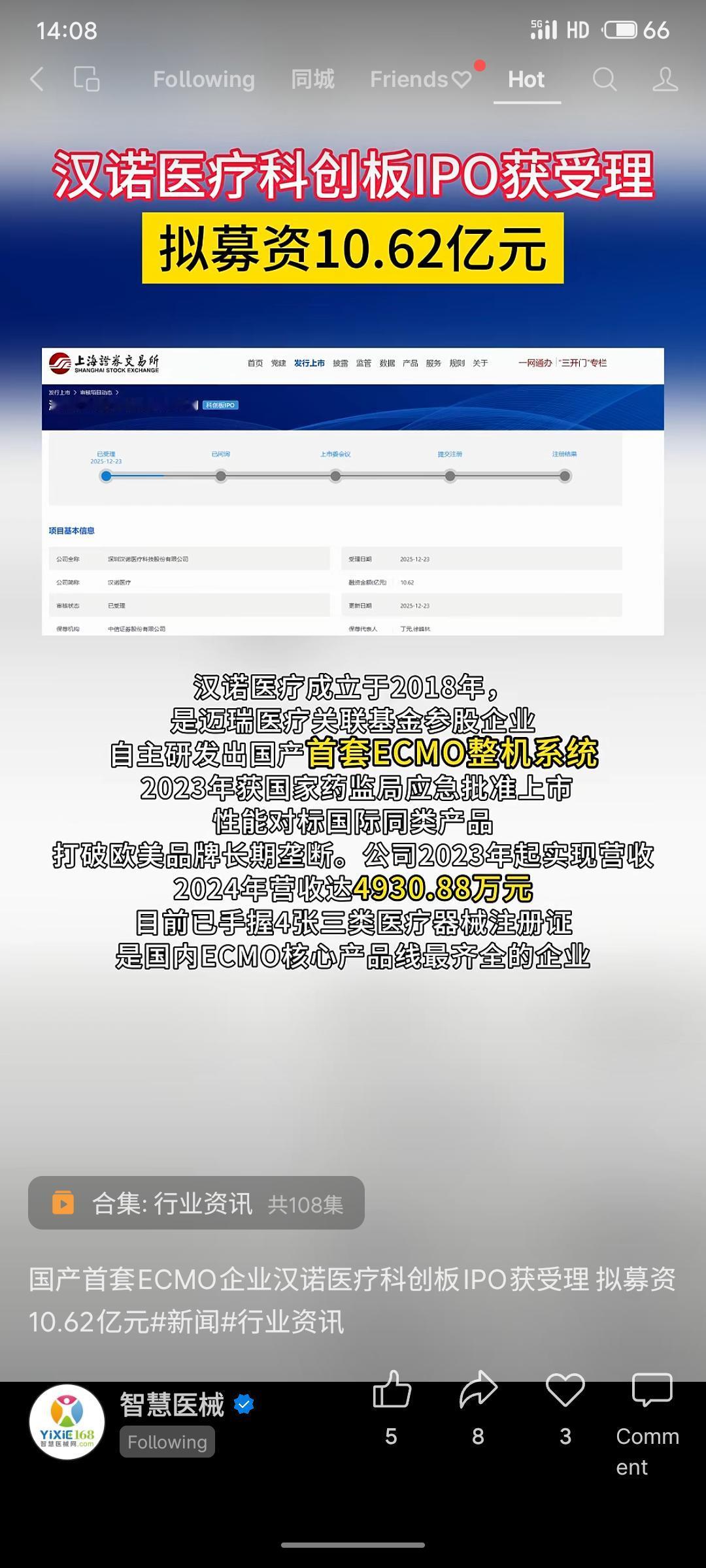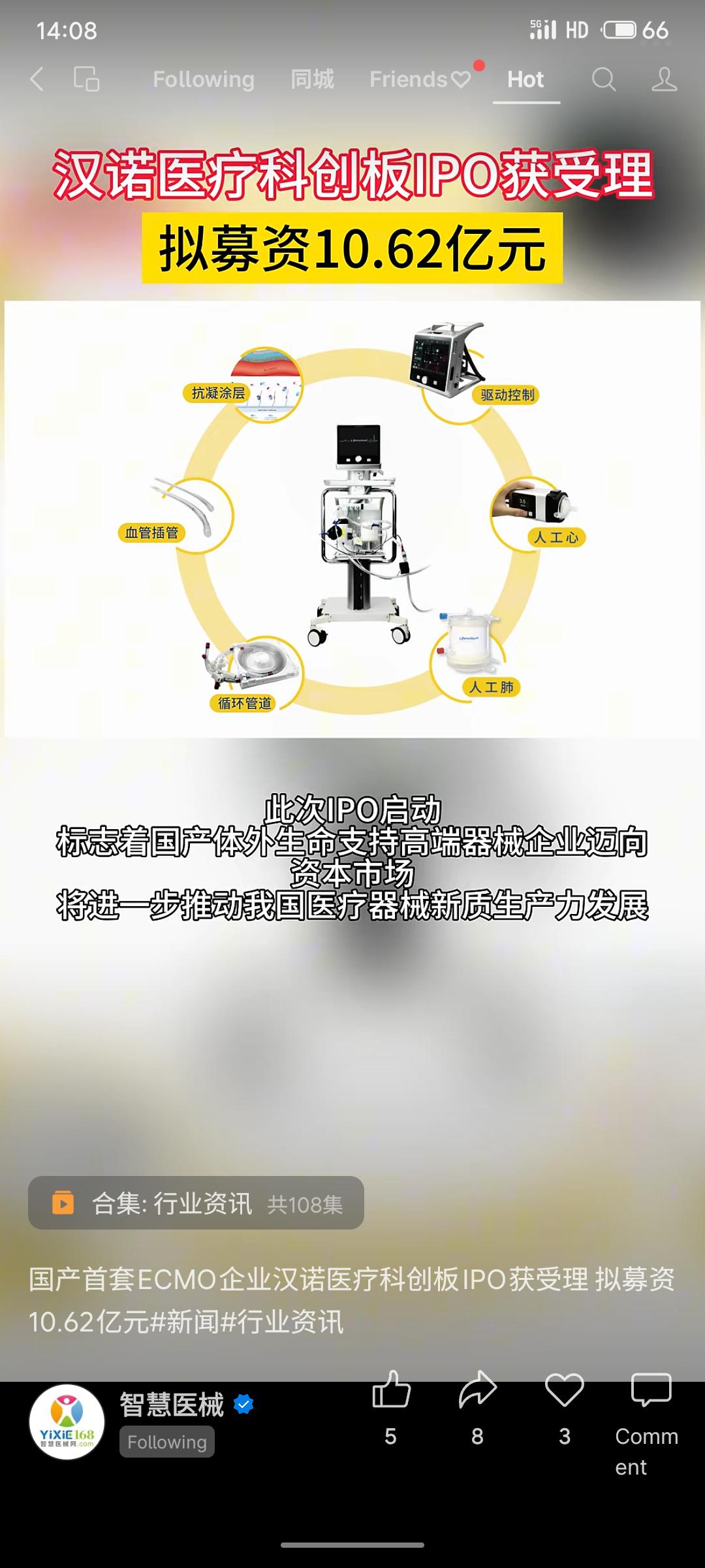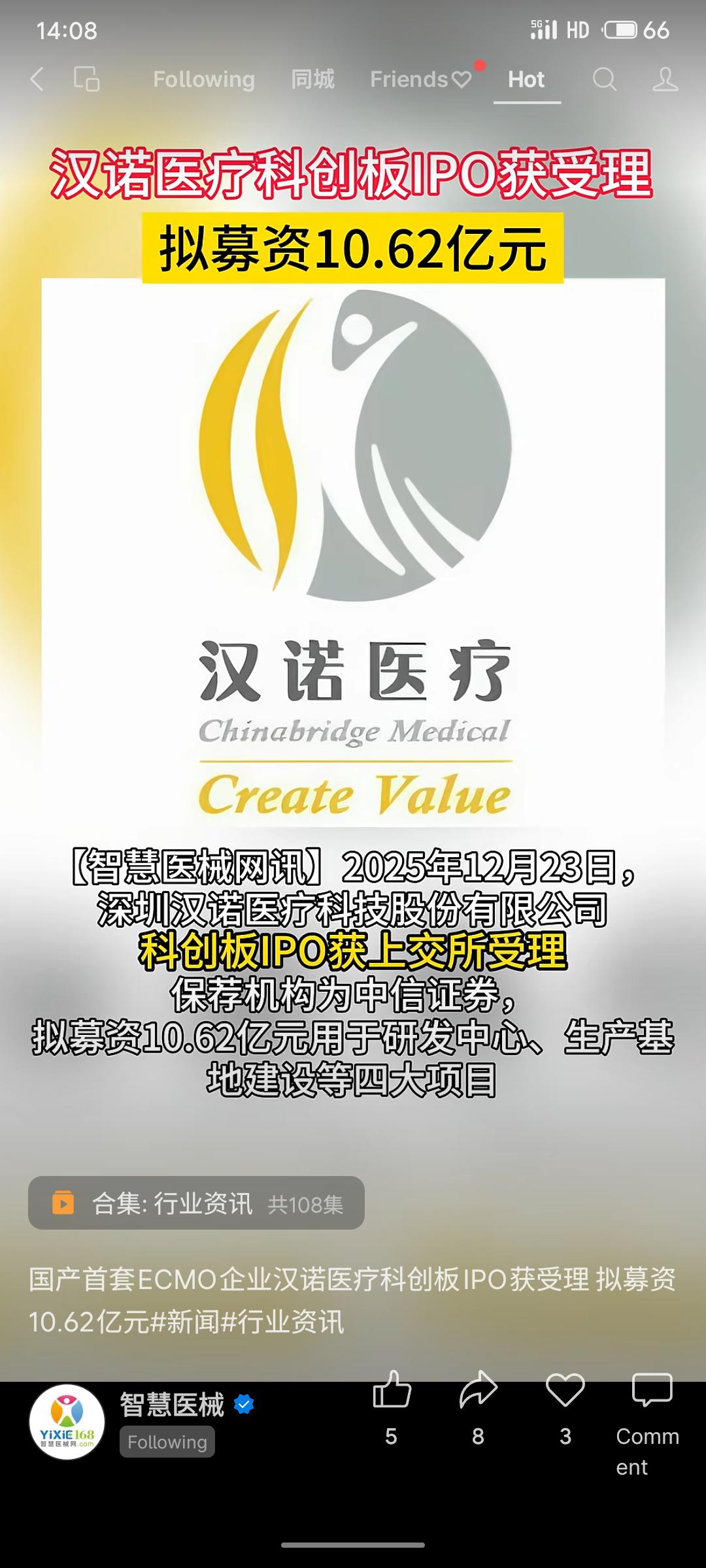深圳汉诺医疗科技股份有限公司(简称“汉诺医疗”)于2018年成立,其自主研发的国产首套ECMO整机系统于2023年获国家药监局批准上市,打破欧美品牌垄断。公司手握4张三类医疗器械注册证,是国内ECMO核心产品线最齐全的企业。2025年12月23日,公司科创板IPO获上交所受理,拟募资10.62亿元用于研发中心及生产基地建设等项目,标志着国产高端体外生命支持器械迈向资本市场。