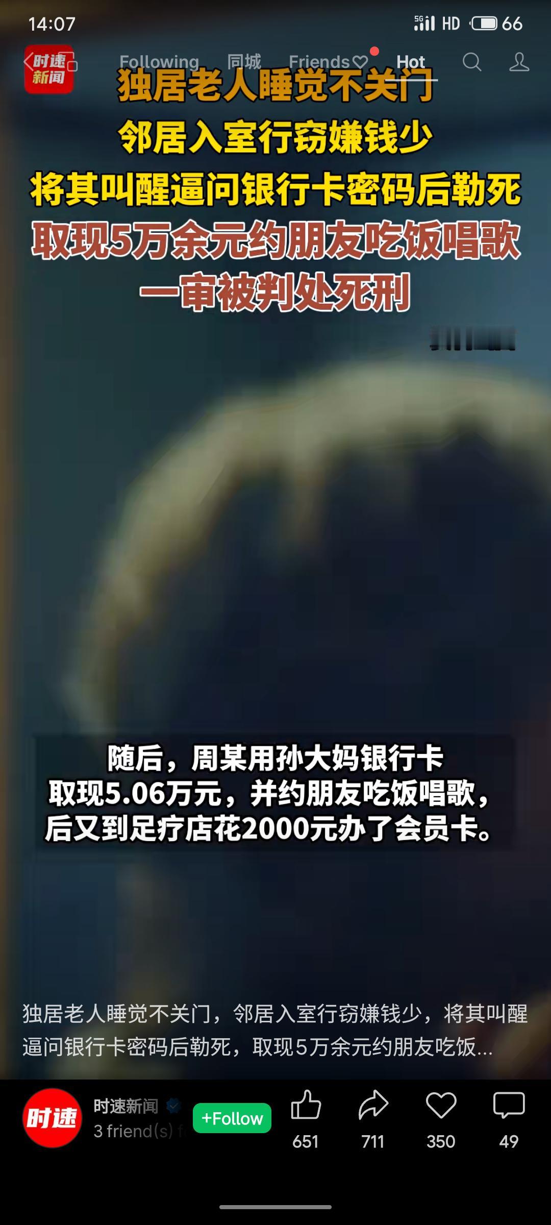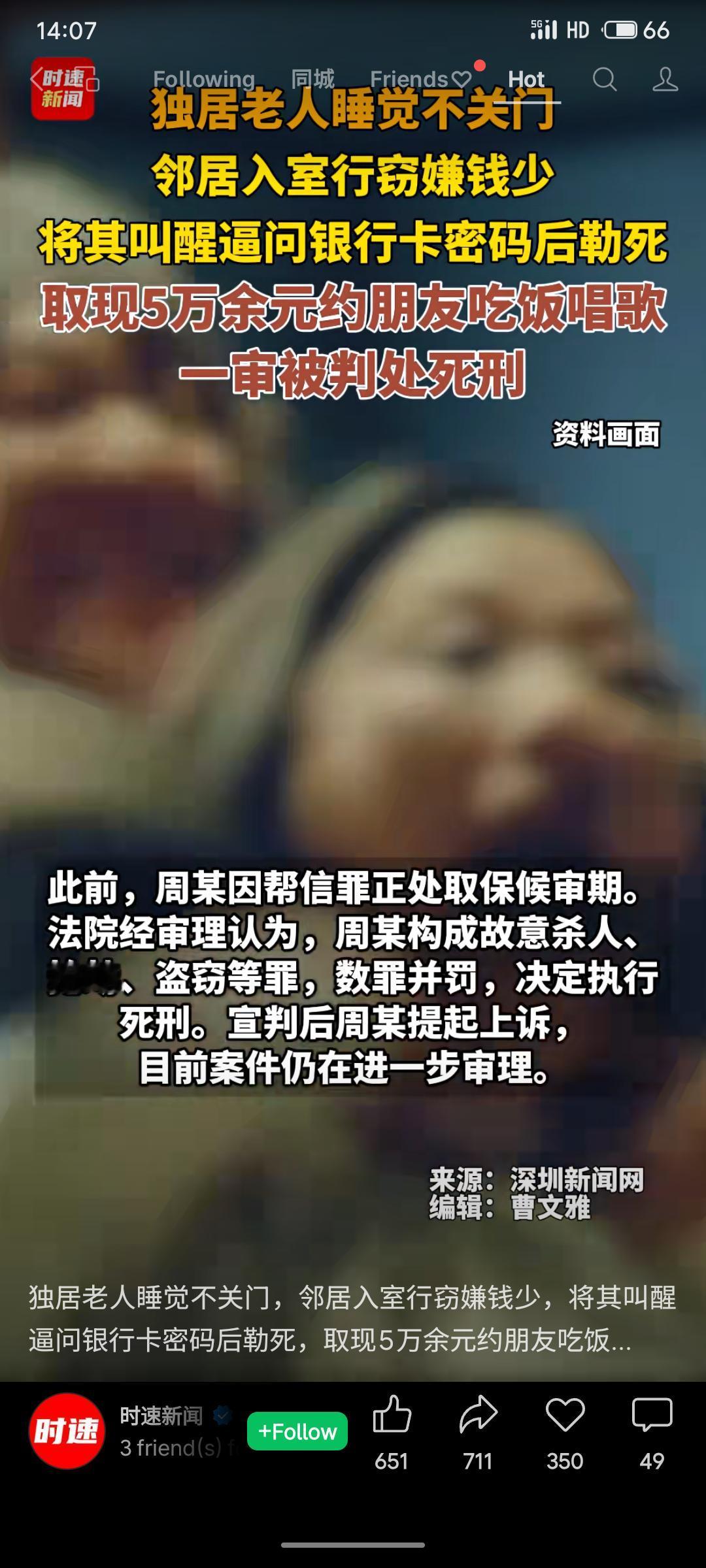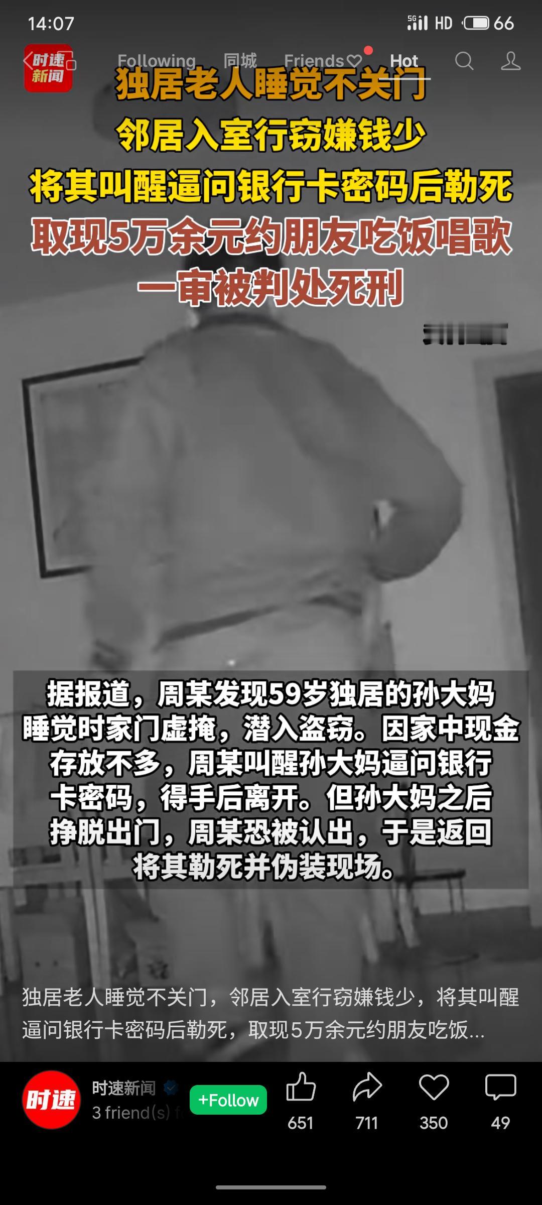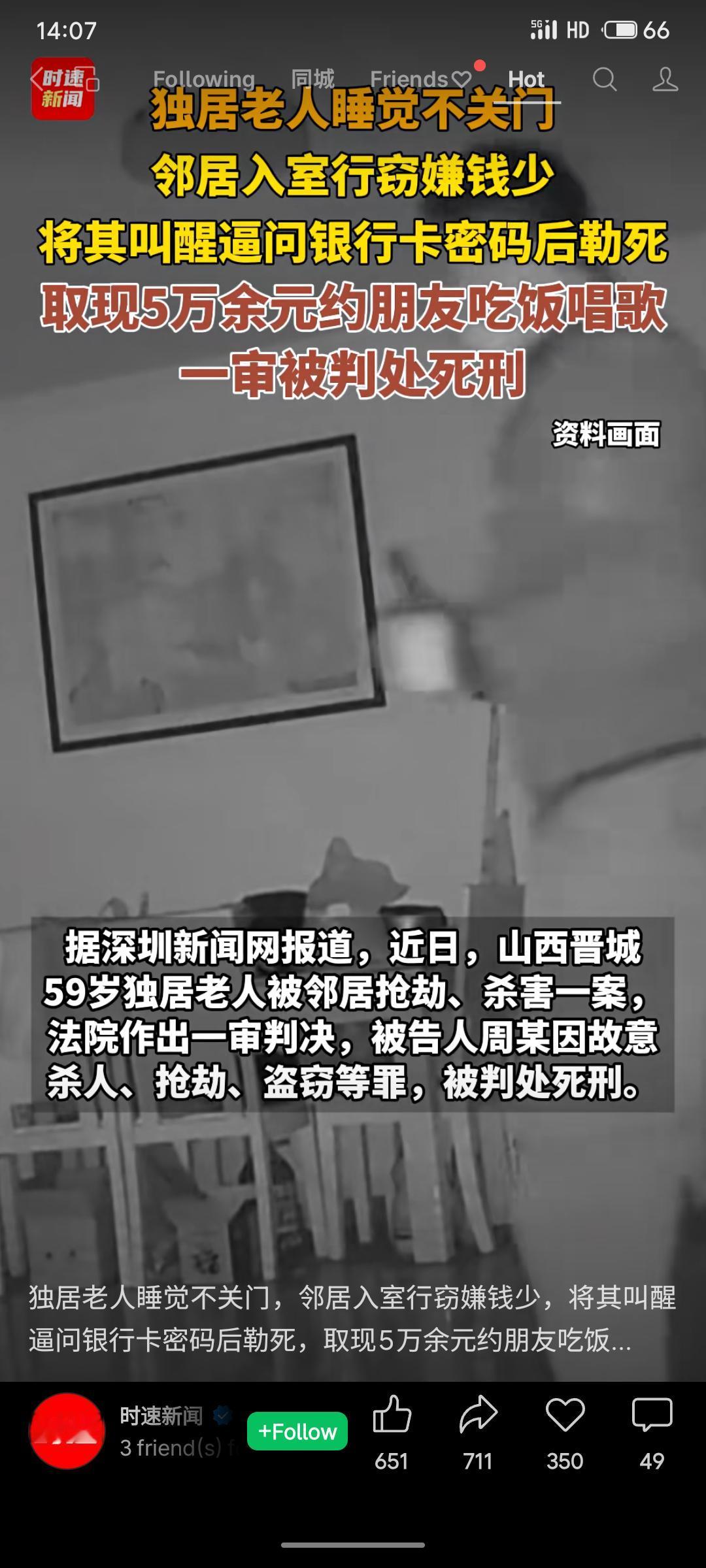 山西晋城一名59岁独居老人因睡觉未关门,遭邻居周某潜入盗窃。周某因嫌现金少,竟将老人叫醒逼问银行卡密码,得手后离开。因老人挣脱出门,周某恐被认出,遂返回将其勒死并伪装现场。随后,周某用银行卡取现5万余元,用于聚餐、唱歌及办理足疗店会员卡。周某此前因帮信罪正处取保候审期。法院一审以故意杀人、抢劫、盗窃等罪数罪并罚,判处其死刑。周某已提起上诉,案件仍在审理中。