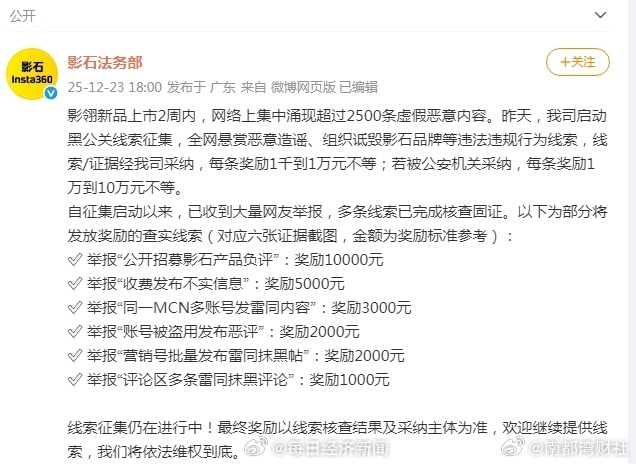 【#影石法务部全网悬赏最高奖10万#】#影石自称2周内遭2500条黑帖攻击# 23日晚间,影石创新法务部发布消息称,旗下影翎新品上市2周内,网络上集中涌现超过2500条虚假恶意内容。22日,该司启动黑公关线索征集,全网悬赏恶意造谣、组织诋毁影石品牌等违法违规行为线索,线索/证据经采纳,每条奖励1千到1万元不等;若被公安机关采纳,每条奖励1万到10万元不等。以上消息还显示,自征集启动以来,已收到大量网友举报,多条线索已完成核查固证。资料显示,影石创新成立于2015年,产品包括全景相机、广角相机、手持摄影设备、专业级VR相机等。影石于本月初发布首款全景无人机影翎Antigravity A1。12月22日,影石创新在互动平台回答投资者提问时表示,影翎A1全景无人机产品已实现部分区域市场的上市售卖。(每经)