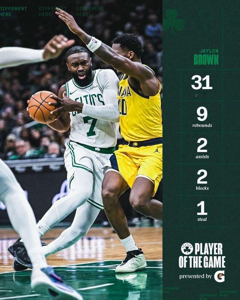 杰伦成为了凯尔特人队史上第三位连续7场砍下30+的球员,前两位是拉里-伯德和保罗