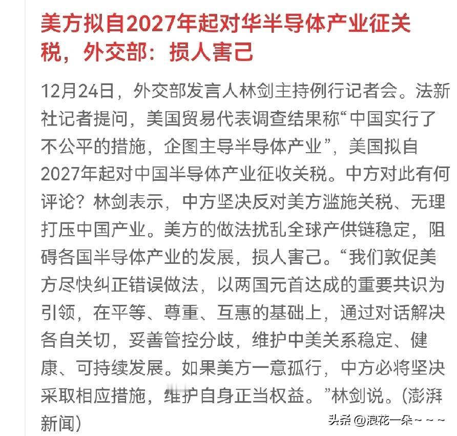 损人害己! 老美这是又坐不住了?又要准备2027年对进口半导体加征关税?这老剧本,美帝国主义天天拿出来用,已经没人看了! 是不是英伟达h200芯片现在没人要了?我看今天英伟达老总放话说希望在春节前出售H200芯片给中国,但是他确切的说,现在还没有收到信息,中国到底要不要呢? 现在的美方突然拍脑袋说明年要对半导体加征关税,这不是明摆着之前设想从英伟达公司收取25%的提成拿不到了吗?所以,开始做损人害己的事情!这剧本受伤的还是美国的半导体公司啊。[捂脸]