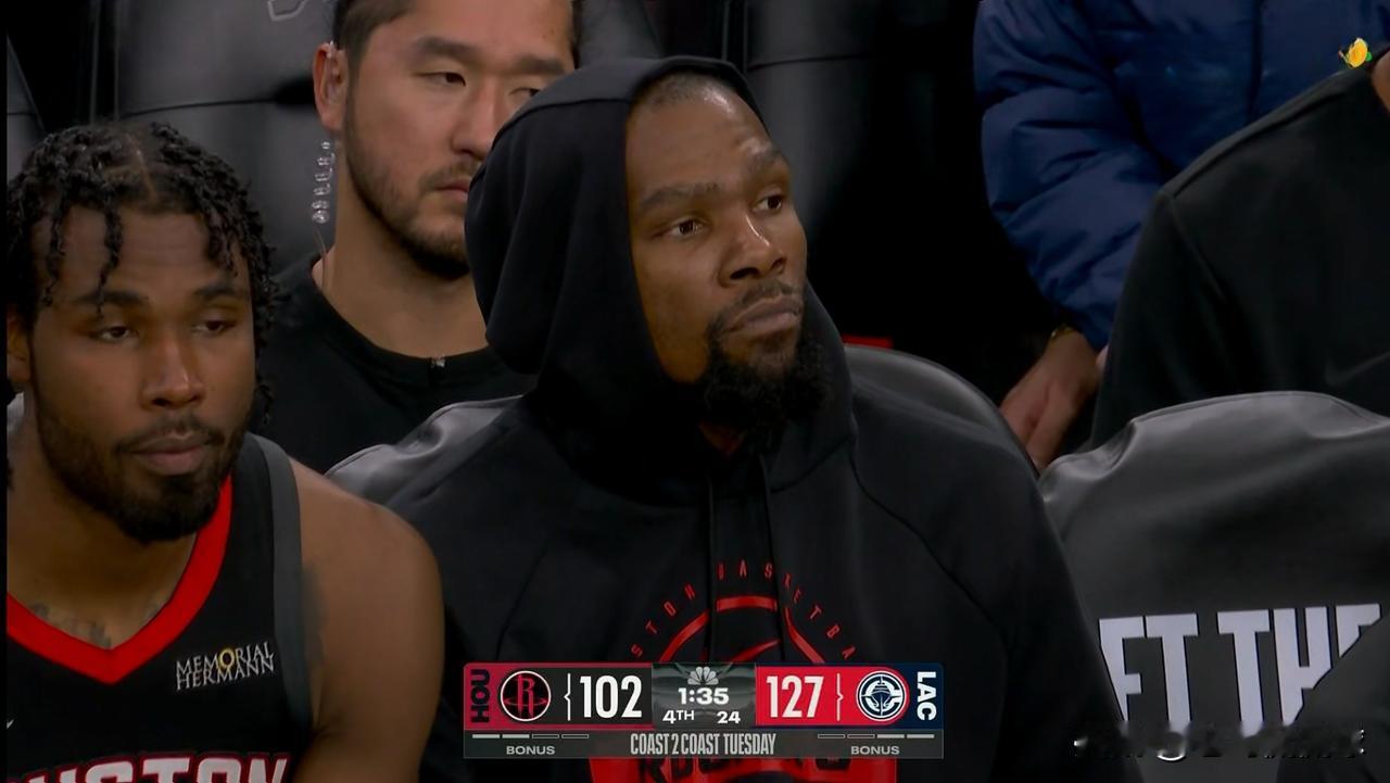 火箭老将杜兰特真是满脸愁容!在今天火箭客场挑战快船的比赛中,当时距离全场比赛结束还剩最后的1分35秒,火箭以102:127落后对手25分,此时转播镜头给到了场下的杜兰特,只见他满脸愁容的坐在替补席上,整个人看起来非常的焦虑和忧愁。虽然我不清楚此时此刻杜兰特在想些什么,但是他肯定已经意识到球队还不具备争冠的能力。