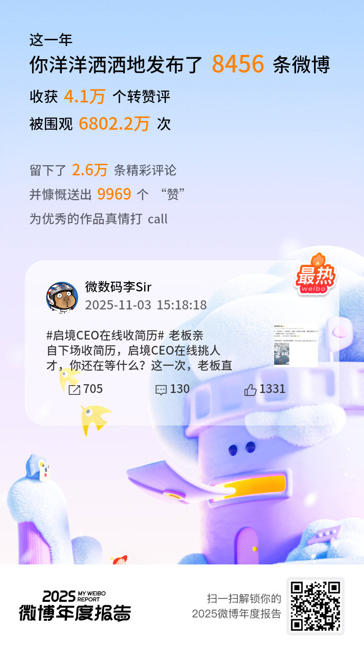 微博年度报告 实力这一块,咱确实拿捏了!相逢的意义在于彼此照亮,这份成绩单离不开你们一直以来的支持和陪伴!你的专属年度播报也已生成,速来>>2025微博年度报告 围观!微博之夜