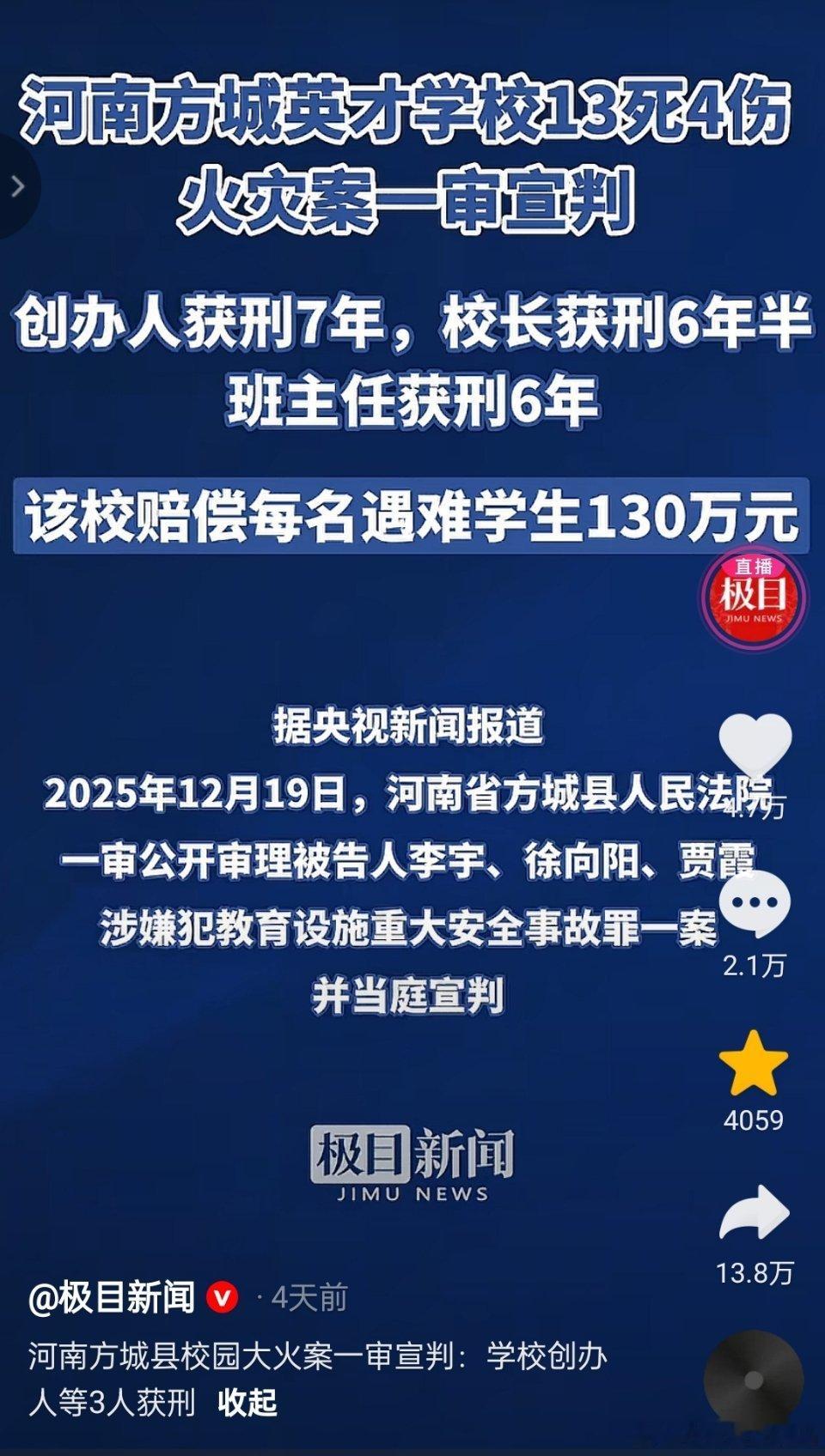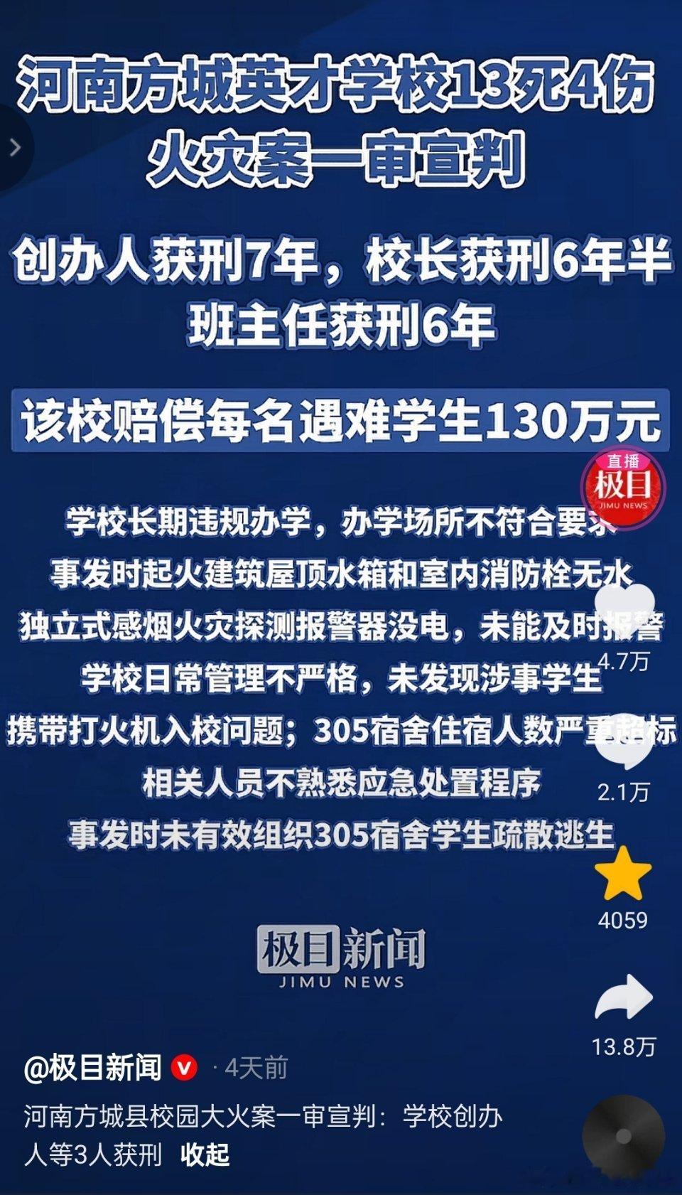 媒体:河南方城县校园火灾案一审宣判:创办人判7年,校长判6年半,班主任判6年。河南火灾班主任