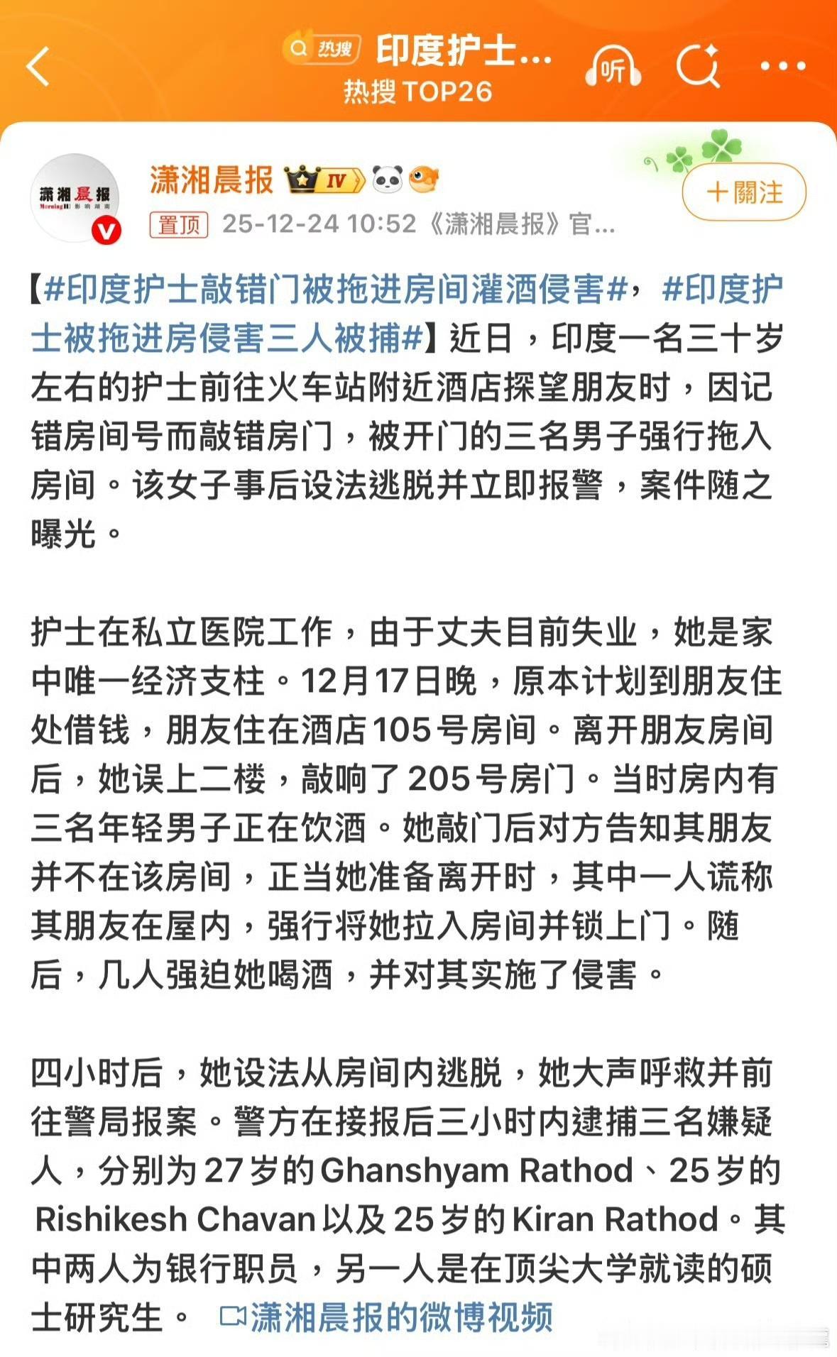学历能过滤掉无知,却筛不掉根植于骨血的恶,仅仅因为一次敲错门,印度护士就被拖进房间灌酒侵害! 30岁的受害护士是家庭唯一经济支柱,丈夫失业后,她前往奥兰加巴德火车站附近的酒店105号房向朋友借钱。离开时误上二楼敲响205号房门,被三名饮酒男子诱骗入内,强行灌酒并实施侵犯。 讽刺的是,三人中两人是银行职员,另一人为顶尖大学在读研究生。顶着“精英”的光鲜头衔,仅仅因为护士敲错一扇门,就将人诱入房间、强行灌酒、实施侵犯。 他们的高学历、好职业,没能教会他们对生命的敬畏,没能涵养出对女性的尊重,反而成了掩盖卑劣行径的遮羞布。 受害护士拼尽全力逃脱报警后,三人虽在三小时内被捕,但案件背后暴露的问题早已超越个体恶行:人流量密集的酒店,为何能让女性被非法拘禁四小时而无人察觉?拥有稳定职业与高等教育背景的“精英”,为何会沦为集体施暴者?答案,藏在印度社会层层嵌套的结构性病灶中。 性别暴力的阴影,从未因阶层与教育而止步。此案颠覆了“底层男性更易犯罪”的刻板印象,印证了印度的性别压迫早已穿透阶级壁垒——从《摩奴法典》将女性定义为“附属品”的文化基因,到种姓制度下女性沦为“男性附属物”的现实处境,性别歧视已内化为社会潜意识,即便是精英群体,也难逃这种文化痼疾的侵蚀。 文明的刻度,从来不是看精英阶层的学历有多高,而是看社会对弱者的保护有多强——这道题,印度显然还远未及格。
