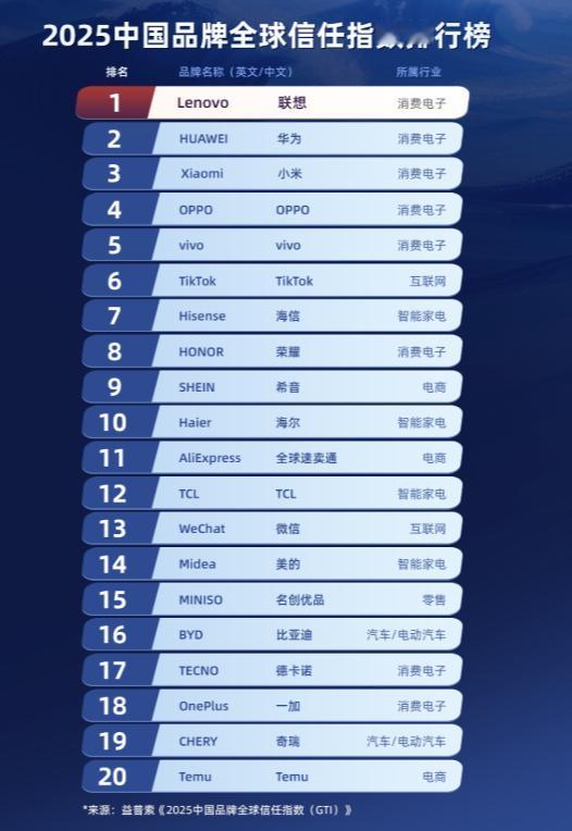 联想竟然登上了中国品牌全球信任榜榜首,不但超越了华为,而且还超越了比亚迪,而华为则屈居第二,小米则尾随华为之后,位居第三名。华为夹在联想、小米两大巨头之间,不尴不尬。 以前还用过联想IBM的笔记本,但自从华为有了笔记本之后,基本上华为是唯一的选择,联想手机曾经风生水起,现在基本上也难以见到身边的人用。