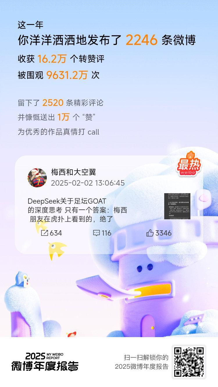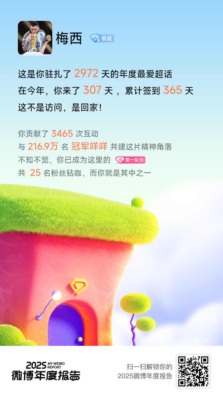 天选社交悍匪2025微博全勤捷报喜报!2025我的V影响力力持续在线:金V成就闪耀121天,橙V成就点亮244天! 感谢家人们一路力挺!来看看你的年度总结吧~入口在这里点击开启>>2025微博年度报告 微博年度报告微博之夜