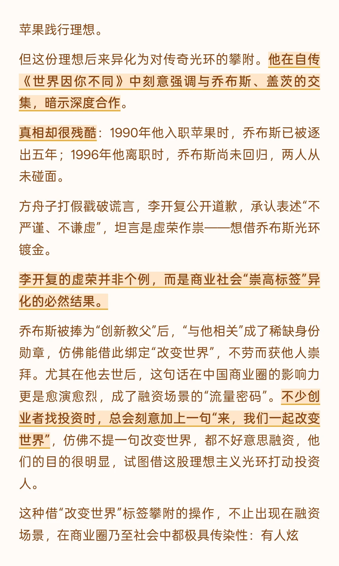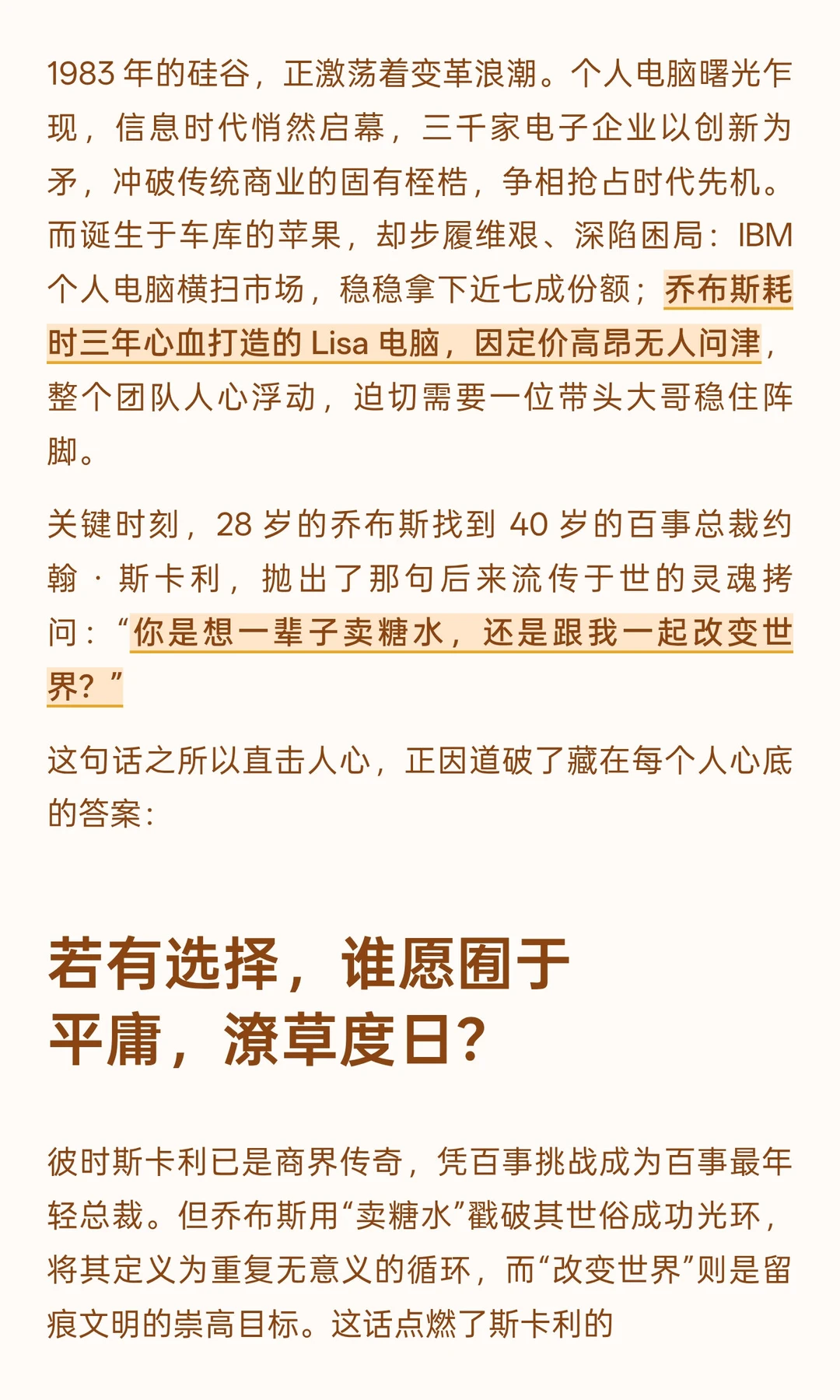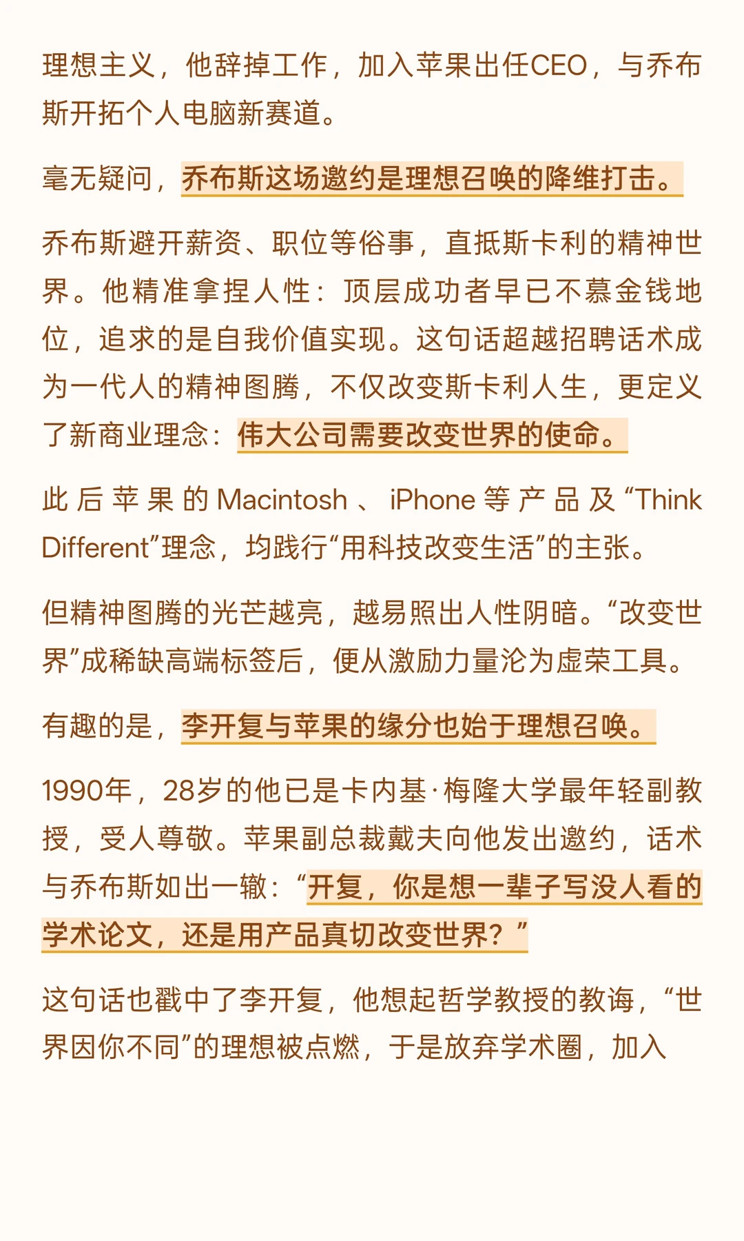 1983 年的硅谷,正激荡着变革浪潮。个人电脑曙光乍现,信息时代悄然启幕,三千家电子企业以创新为矛,冲破传统商业的固有桎梏,争相抢占时代先机。而诞生于车库的苹果,却步履维艰、深陷困局:IBM 个人电脑横扫市场,稳稳拿下近七成份额;乔布斯耗时三年心血打造的 Lisa 电脑,因定价高昂无人问津,整个团队人心浮动,迫切需要一位带头大哥稳住阵脚。 关键时刻,28 岁的乔布斯找到 40 岁的百事总裁约翰・斯卡利,抛出了那句后来流传于世的灵魂拷问:“你是想一辈子卖糖水,还是跟我一起改变世界?” 这句话之所以直击人心,正因道破了藏在每个人心底的答案: 若有选择,谁愿囿于平庸,潦草度日? 彼时斯卡利已是商界传奇,凭百事挑战成为百事最年轻总裁。但乔布斯用“卖糖水”戳破其世俗成功光环,将其定义为重复无意义的循环,而“改变世界”则是留痕文明的崇高目标。这话点燃了斯卡利的理想主义,他辞掉工作,加入苹果出任CEO,与乔布斯开拓个人电脑新赛道。 毫无疑问,乔布斯这场邀约是理想召唤的降维打击。 乔布斯避开薪资、职位等俗事,直抵斯卡利的精神世界。他精准拿捏人性:顶层成功者早已不慕金钱地位,追求的是自我价值实现。这句话超越招聘话术成为一代人的精神图腾,不仅改变斯卡利人生,更定义了新商业理念:伟大公司需要改变世界的使命。 有趣的是,李开复与苹果的缘分也始于理想召唤。 1990年,28岁的他已是卡内基·梅隆大学最年轻副教授,受人尊敬。苹果副总裁戴夫向他发出邀约,话术与乔布斯如出一辙:“开复,你是想一辈子写没人看的学术论文,还是用产品真切改变世界?” 这句话也戳中了李开复,他想起哲学教授的教诲,“世界因你不同”的理想被点燃,于是放弃学术圈,加入苹果践行理想。