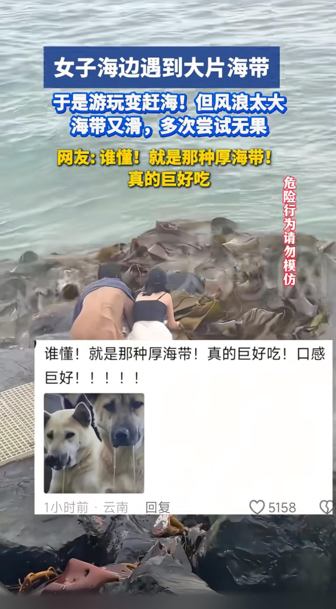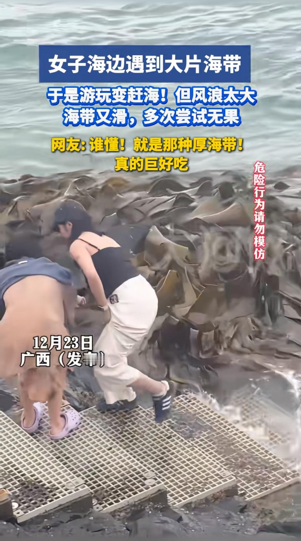 前几天刷到个视频,一勇敢女子海边游玩时,意外碰到大片海带,直接把游玩变成赶海。她那架势,一看就是想把这海带都“收入囊中”。 可这赶海哪有那么容易,海上风浪大得很,海带还特别滑。女子一次次伸手去抓,海带就像调皮的鱼儿,一次次从她手里溜走。好几次她都差点被海浪拍倒,但就是不放弃。 网友们也在评论区炸锅了,好多人说:“谁懂啊,那种厚海带巨好吃!”估计大家都被女子的执着感染,也馋那海带的美味了。这女子和海带的较量,真是一场有趣的海边奇遇。