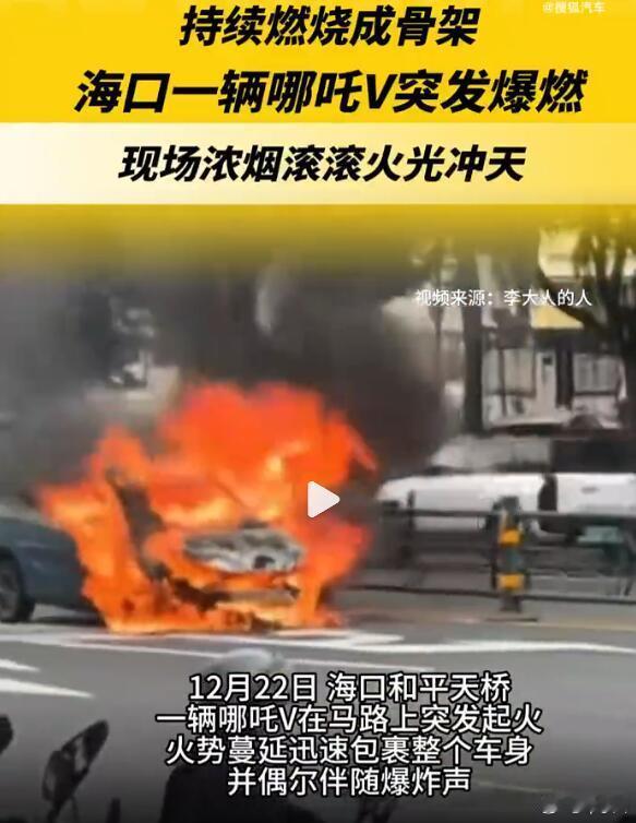 据说是一辆哪吒V,这车可真是烧一辆少一辆了,绝版。看这个火势应该是电池出问题了,在哪吒V生产的那个时候,电池的可靠性确实有不少问题,而这两年看到的行驶中自燃的情况已经越来越少。只希望,有一天我们的新能源产业能够真的把“自燃”这个词从词典里删掉吧…..海口一轿车突发爆燃新能源汽车爆燃仅剩车壳