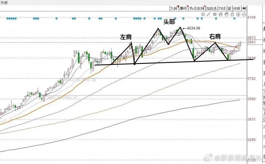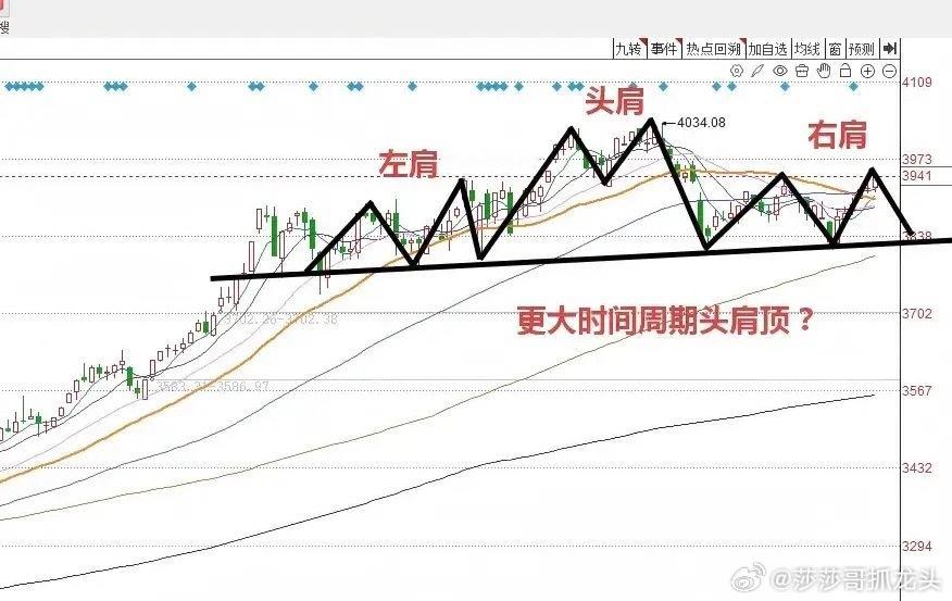 今天A股缩量破了前高,走出了6连阳形态化解了头肩顶压力,接下来还能继续看多吗?大家来认真看从今天市场的走势来看,上证指数再度上涨,而且午后出现了加速上涨,并且突破了日线级别前期高点,12月8号的高点3936点——这是一个非常关键的阻力位。今天突破这个点位之后,对于指数层面来说,其实基本上算是化解了短线头肩顶的这种不利形态压制的局面。大家请看图一,上证指数潜在的头肩顶结构图。今天突破3936点之后,这个头肩顶算是得到了有效的化解。毫无疑问,对于今天的A股来说是非常棒,也是非常强的一天。因为在莎莎的预期当中,上证指数在昨天走出五连阳走势之后,今天应该出现一次单日阴线的调整,大家请看图二我昨天更新的关于今天走势的手绘预测图。很显然这个预判是被主力狙击了。真是万万没有想到,今天的走势还能这么强。属实今天是有一点超预期的!莎莎实在是佩服回到问题的重点, A股今天6连阳的强劲走势,又化解了近期头肩顶的压力,那么是不是接下来要展开波段的主升浪了呢?兄弟朋友闷在这里听莎莎讲三个观点:第一,上证指数既然已经走出了六连阳的走势,六连阳的走势,虽然代表了短线强势的走法,但是也代表了接下来收阴线的概率,比昨天又更大了一些;第二,今天虽然指数全线上涨,但是今天的成交量比昨天还萎缩了241亿,缩量上涨的情况下,出现了一定的量背离走势。量能背离的情况下,有可能意味着短线的涨势可能会出现回撤。第三,虽然上证指数已经化解了短线头肩顶的压力,但是可能处在更大形态上的可能的头肩顶结构当中。大家请看图三,上证指数日线图。从图三当中,我们可以发现,如果将时间周期再扩大一些,当前的形态依然可以认为处在头肩顶的可能性之下。只不过,无论是左肩头部,还是右边肩膀,大家都可以发现,它是由小双头组成的——是一个异形的大型头肩顶结构。当然,大家不必过度担心,我们可以发现,上一次市场指数跌到3816点的时候,当时也面临头肩顶破位的风险,不过当时莎莎就明确告诉大家,主力不会破位,3816点就是铁底支撑。所以,如果当前市场依然处在这种大型的头肩顶结构的可能性之下,我预计381 6:00接下来依然会成为市场的强支撑。我们依然可以大胆的判断,接下来3816点,将是很长一段时间的铁底支撑。最后总结一下,今天市场再次走出了超预期的行情,但是在乐观的同时,我们也要保持一定的警惕。因为市场很有可能是波段式前进,也就是说市场整体重心会缓慢的抬高,但其间也不乏短线的回撤波段,作为一个纯技术派的老手就是要尽量的让大家规避这些调整的时间。收评就和大家聊的这里,关于明天走势的手绘预测图,我将会在稍晚一点更新,兄弟朋友们点赞,评论就是对我这个纯技术派的最大支持!
