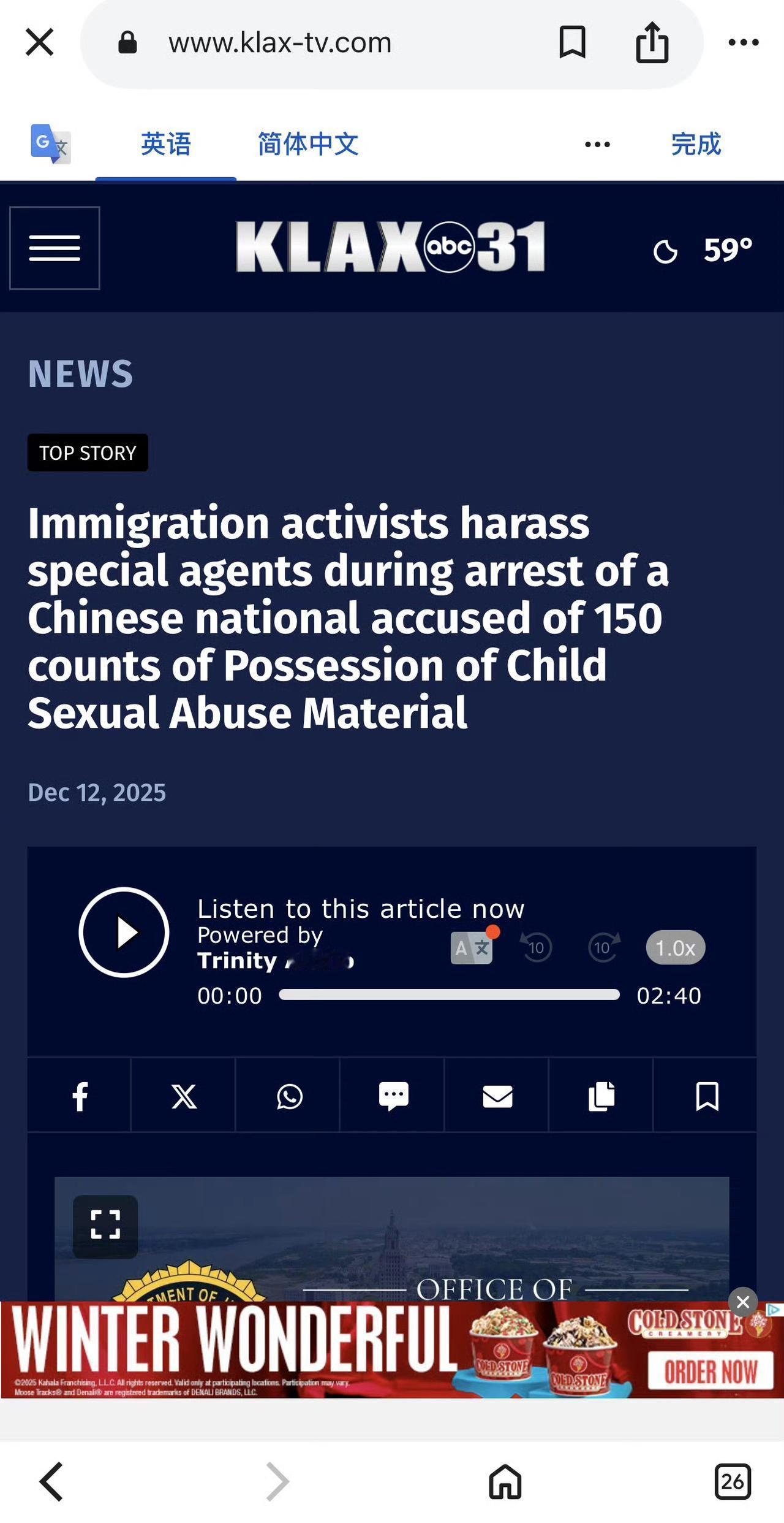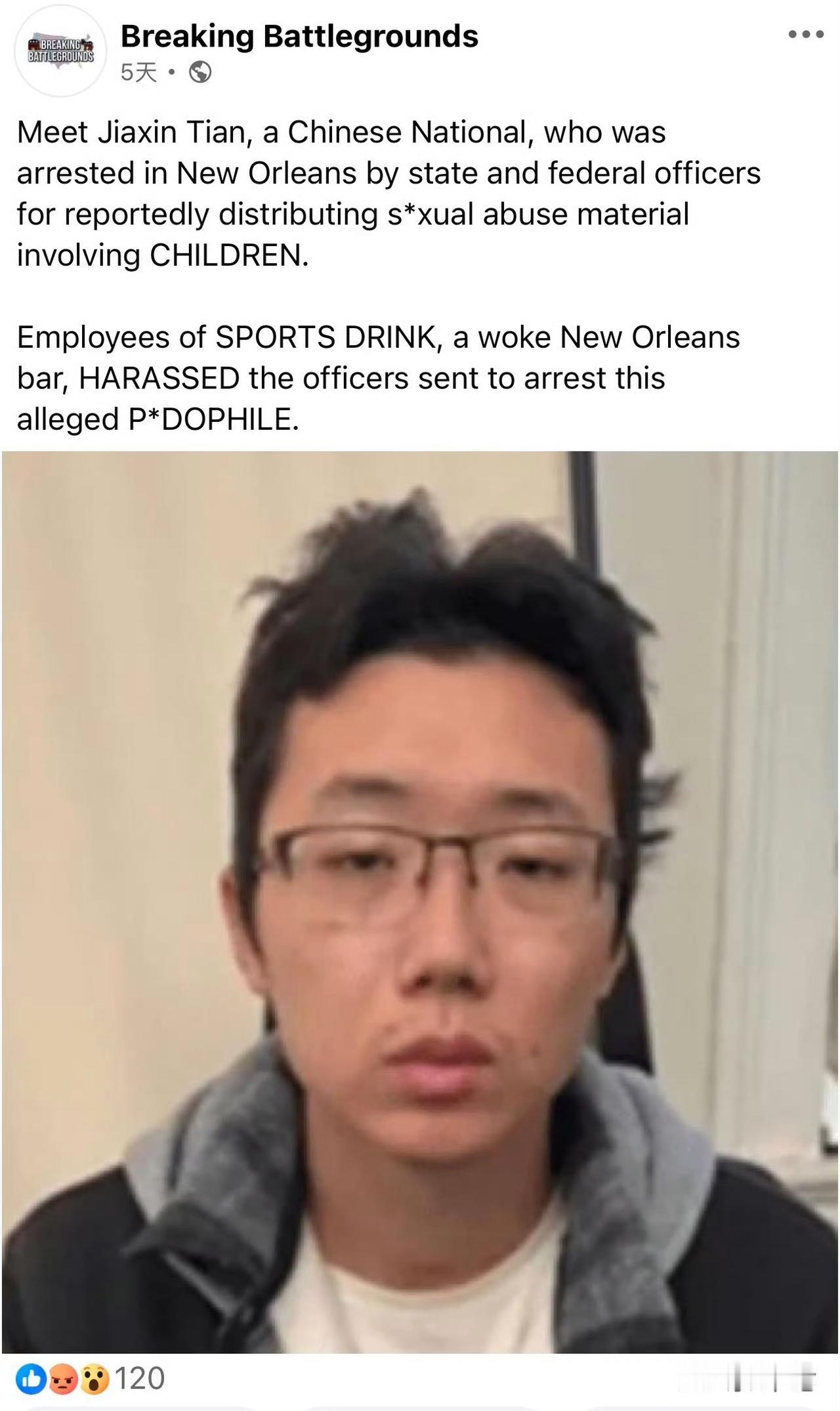 美国一个中国留学生田家鑫被控150项儿童色情材料罪,警察抓捕过程中意外走红。这名29岁留学生美国路易斯安娜州留学,这天是美国警察、FBI对他的抓捕行动,没想到警察进入他住所行动的时候,恰好遇到一群抗议反移民执法的人员经过,以为是警察抓捕非法移民,于是他们开始了自己的正义之举,阻扰警察的执法。警察不得不出面解释他们是在抓一名儿童色情罪犯,于是这个田家鑫就意外曝光走红了,也意味着彻底社死。无罪未满14岁 留学生丑闻