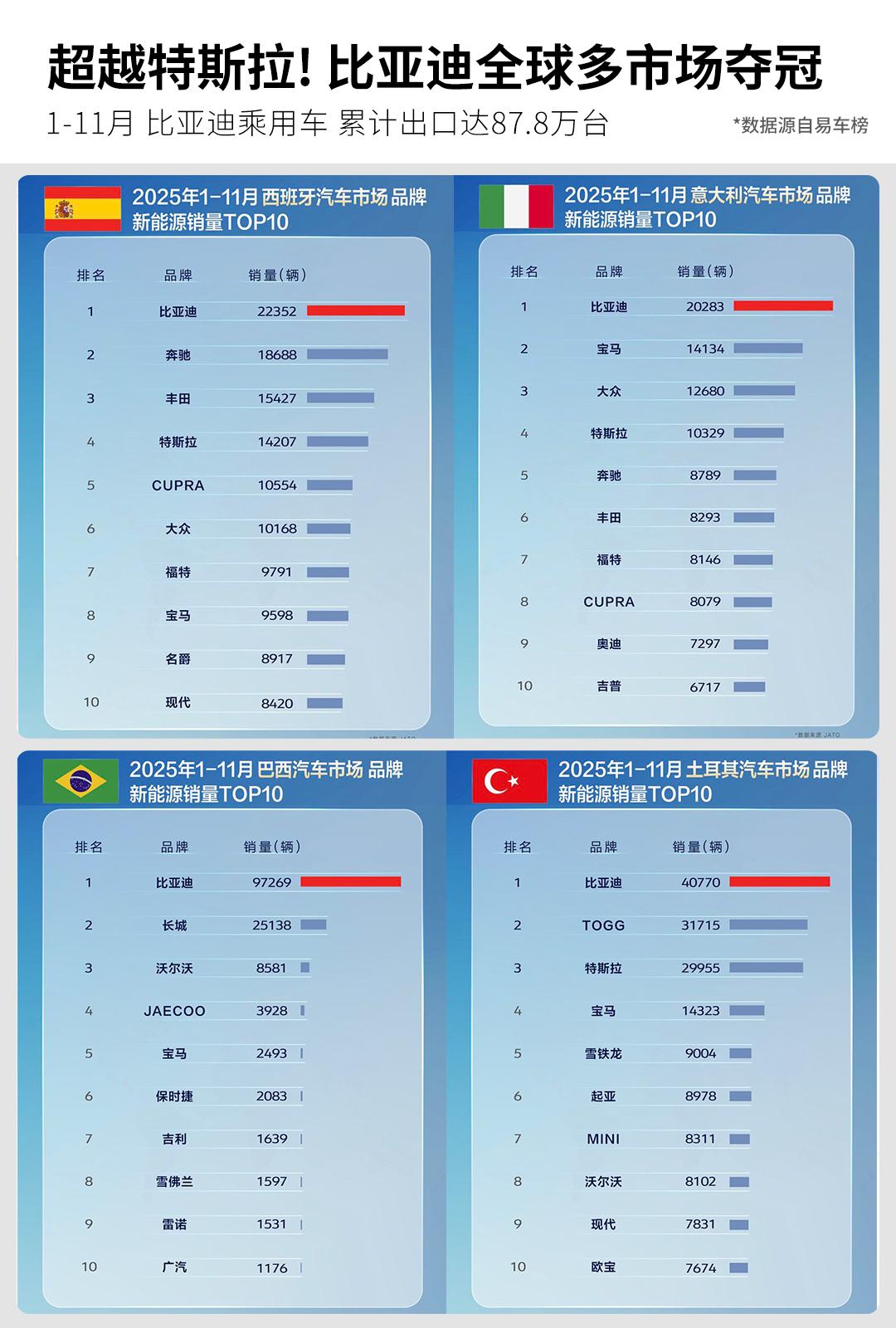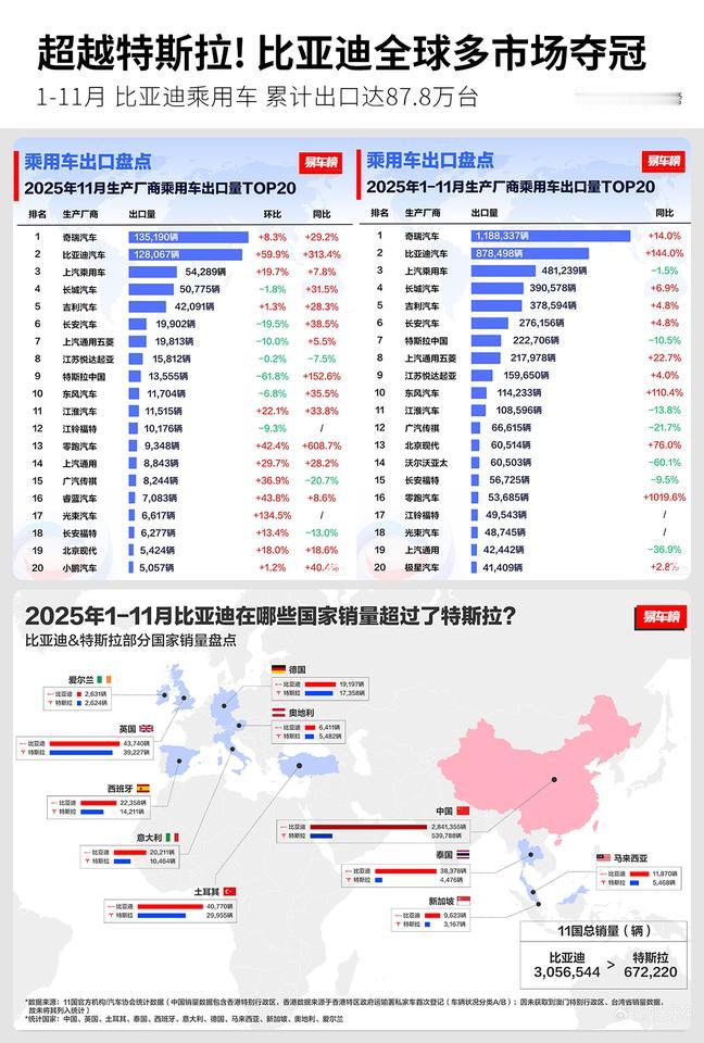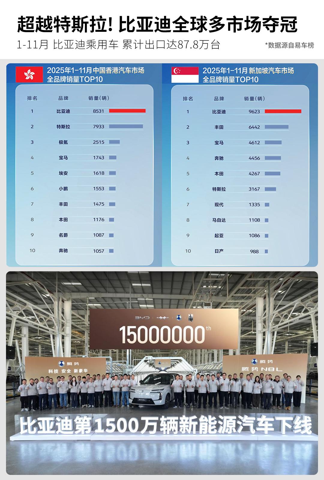 今年前11个月,比亚迪乘用车累计出口87.8万辆,同比增长144%,已超去年全年出口量,成为中国出口增速最快的车企之一。 如今,比亚迪的车已经卖到了全球119个国家和地区,在不少地方都站稳了脚跟——在巴西、土耳其、新加坡等多国市场拿下新能源汽车甚至全品牌的销量冠军。多国销冠全面超越,尤其在英国、德国、意大利等11个重点国家,比亚迪的销量已经超过了特斯拉。 能跑出这样的成绩,不只是因为车型选择多、符合各地需求,也和自建运输船、推进本地化生产这些实实在在的布局分不开。不久前,比亚迪第1500万辆新能源汽车下线,成为全球第一个跨过这个门槛的车企。可以说,中国汽车品牌正在从过去的跟随,一步步走到舞台中央。【来自懂车帝车友圈】