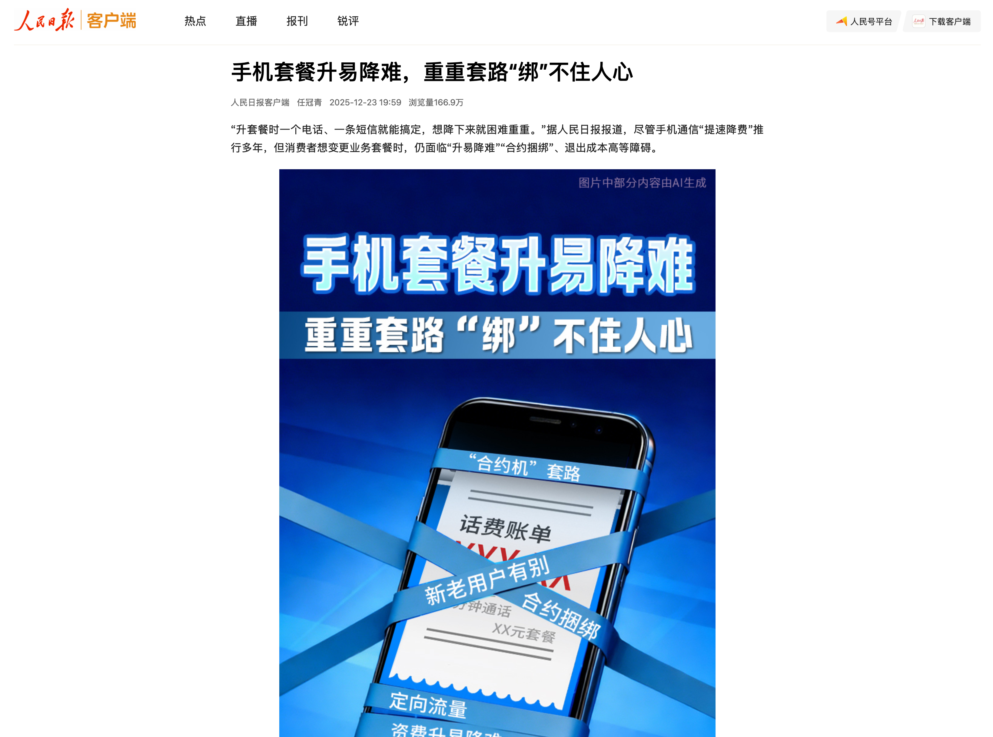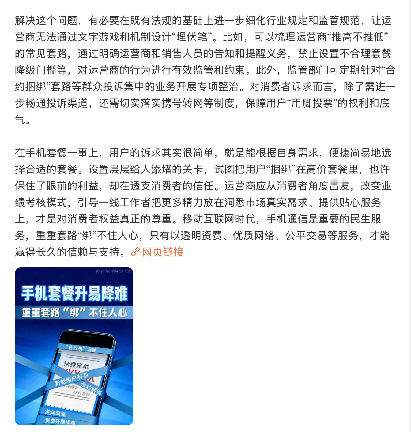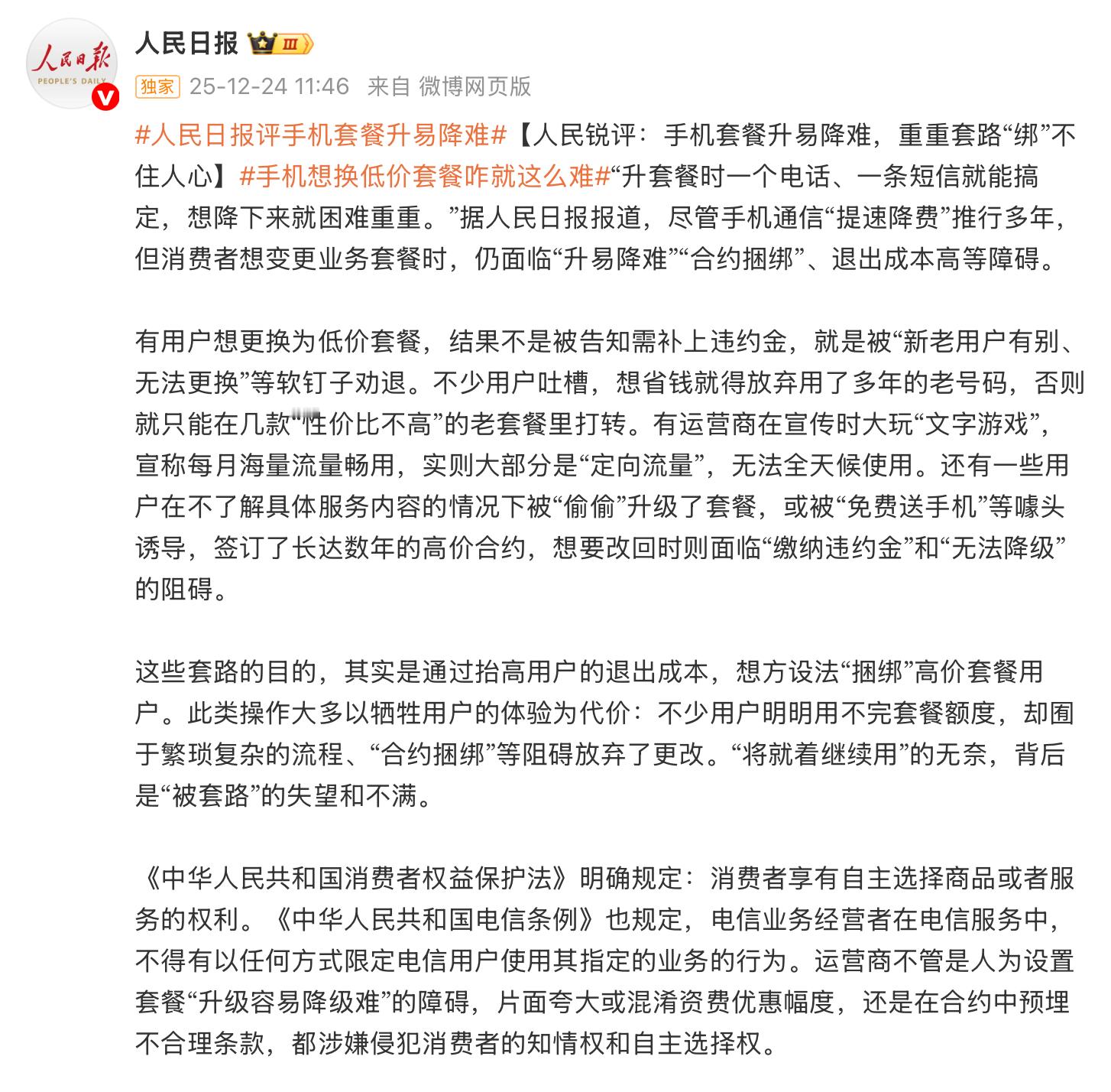 人民日报痛批手机运营商 这事,运营商们,都出来挨打吧。而且不用单指谁,全部都可以出来挨打。这是非常常见的一个问题,升级套餐,一个电话或者一个短信就可以。然后你要改资费低的,短信不行电话不行,甚至当面在营业厅办也不行。而且运营商客服还时不时甚至很经常就打电话给你推销,有什么什么套餐,可以带给你什么“飞一般的感觉”的体验提升。并且有时候你一不小心听他们介绍被忽悠了,说了个好的,然后它立马就给你升级了。回头你要维权,就说是你自己同意的,真的很恶心。另外各种超多流量的,仔细一看,全是各种定向流量啥的。很多根本用不着。所以现在那些运营商的号码来电,都要警惕,大多数没啥好事。真的要升级套餐,自己找找适合自己的,甚至问问身边的朋友的套餐看看有没有合适的。再者,如果一个运营商的服务实在太拉,就考虑转网。现在各家还有大多有一个就是,转网进来的用户会给一定的优惠。当然,也要看一下套餐是否适合自己,资费是否合适。望周知。