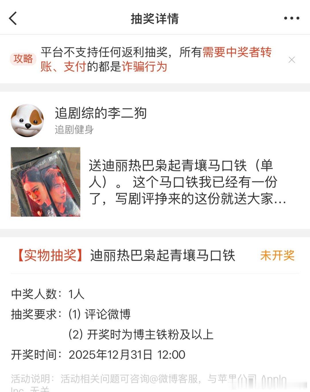 送迪丽热巴枭起青壤马口铁(单人)。这个马口铁我已经有一份了,写剧评挣来的这份就送大家吧。要求主页内没黑过迪丽热巴、二狗铁粉、枭起青壤剧粉(安利过枭起青壤,没有黑过剧)🌟开奖后如不符合上述规则,视为无效。(原本想一条微博把俩主演 的都送了,就怕抽奖结果是同一个主演的粉丝,那样就不够分了。炎拓的我再另开一条微博送) 抽奖详情