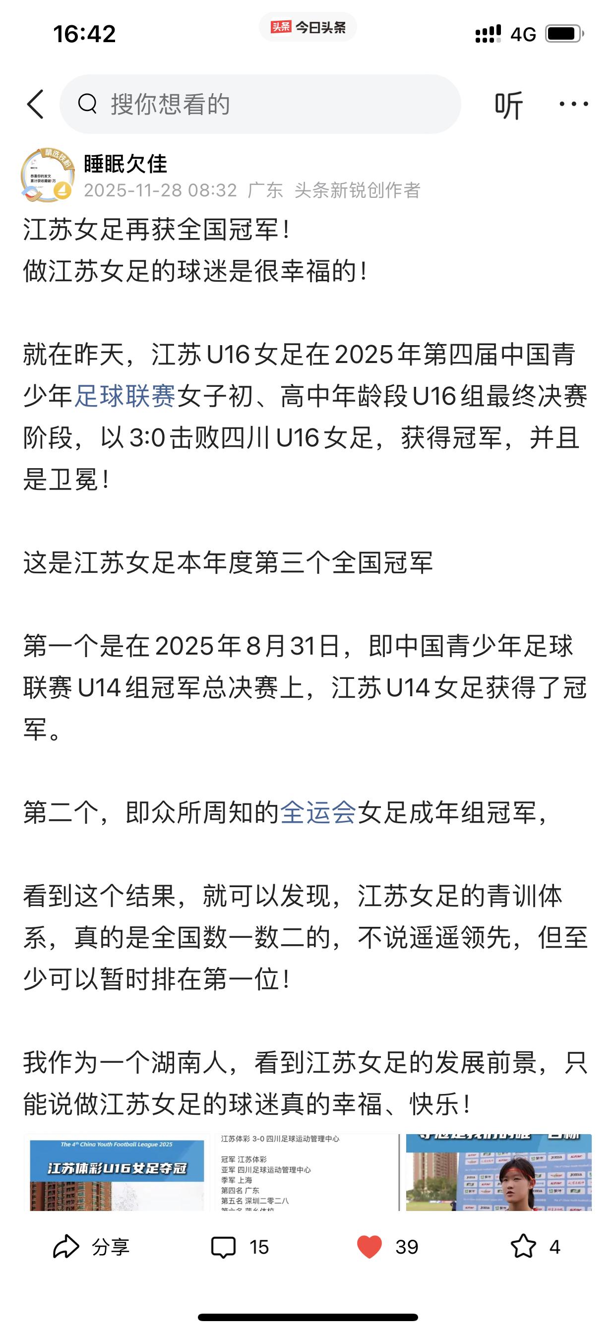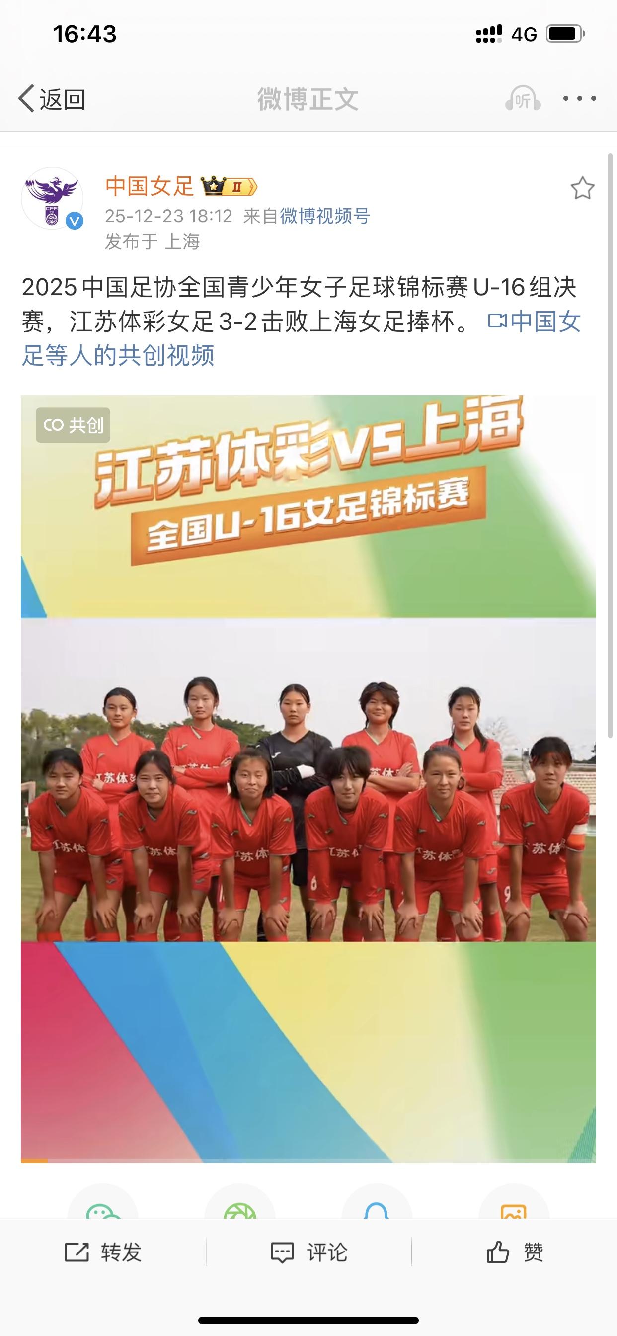 今年江苏女足是不是冠军年?[赞] 因为她们江苏的U系列女足队伍已经在今年斩获第三个全国冠军了! 就在昨天,江苏体彩U16女足在2025中国足协全国U-16女足锦标赛上,以3:2击败上海U16女足,斩获本届赛事的冠军! 也许是我孤陋寡闻,以前没有特别关注江苏U系列女足队伍,所以才知道今年她们斩获冠军多! 我在2025年11月28日发过一篇微头条,就说了江苏女足各年龄段的三支队伍在今年斩获了3个全国冠军,没想到到年尾即将结束时,再为她们的女足队伍拿下一个冠军! 因此,我才说今年是江苏女足的冠军之年啊!