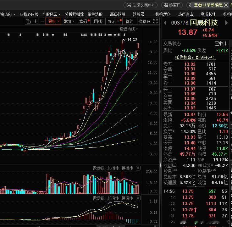 国晟科技,我必须佩服你12月11日放量诱多,全天成交31.3亿换手35.5%,经过两天大跌之后,竟然又神奇的复活了,而且还缩量创出新高。对于这样的走势,我必须讲两个字佩服,四个字实在佩服。根据我的经验,这样的票里面已经没有大的主力机构了,通俗的讲是散户抱团了。接下来,我将跟踪一下主力被淘汰出局的股票怎么玩的?学习一下,随时进步。欢迎加入我们的免费交流群股票 财经