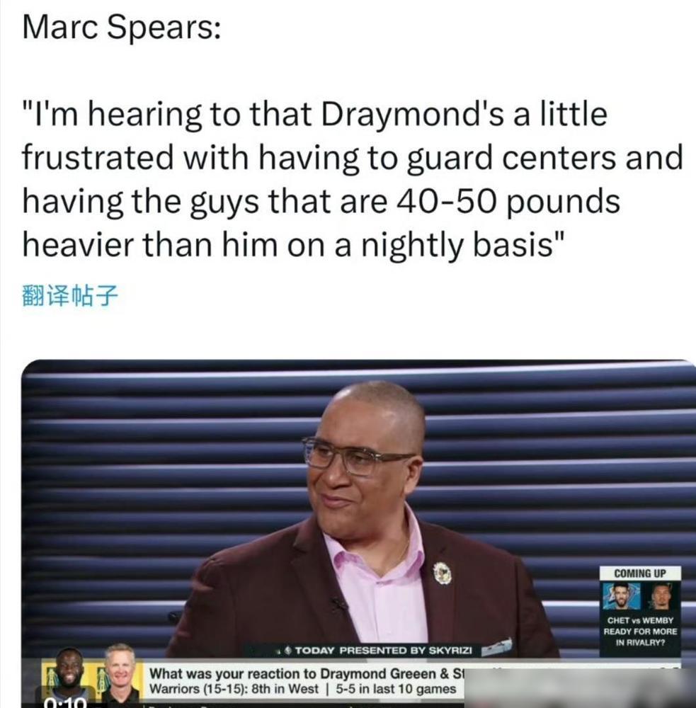 格林沮丧的原因找到了!据权威记者Marc Spears在一档节目中透露,勇士队球员格林感到非常沮丧,因为他每晚都要防守那些比他重40-50磅的中锋。 说白了,一个快36岁的老将天天要在篮下跟那群年轻力壮、吨位还大出一整圈的“怪兽”肉搏,这种体能和心理上的双重消耗,确实挺让人崩溃的。 我总觉得,这种体型上的绝对劣势不是靠意志力就能抹平的。40到50磅的体重差,意味着每一次身体接触都在对抗物理定律,格林再怎么是防守核心,身体也吃不消。 以前大家都关注他情绪容易失控,现在看这爆点其实挺合理的。想想看,你每场球都要替全队扛最脏最累的活,还要面对体能透支后的无力感,换谁都要心态失衡。 勇士现在的防守体系说到底还是太依赖格林了,这其实是管理层的一种变相“压榨”。即使他还是队里最稳的防守闸门,但到了这个年纪,体力一旦亏空,技术动作必然会走形。 现在传出球队想引进罗伯特-威廉姆斯或者克拉克斯顿,这引援方向确实对路。赶紧找个正经的防守型内线来当“保镖”,才能把格林从这种高强度的内线肉搏里解放出来。 毕竟让格林去当个组织型四号位,多动动脑子传传球,总比让他去死磕大中锋要有性价比得多。现在的他对于这种纯肉搏战,恐怕真的是心有余而力不足了。 这种转型的紧迫感,其实也是勇士不得不面对的现实。如果引援还是没动静,光靠沟通和安抚,恐怕很难解决一个老兵生理上的疲惫感。 希望这次变阵能成吧,不然格林这种沮丧情绪如果继续蔓延,对勇士接下来的走势真不是什么好消息。