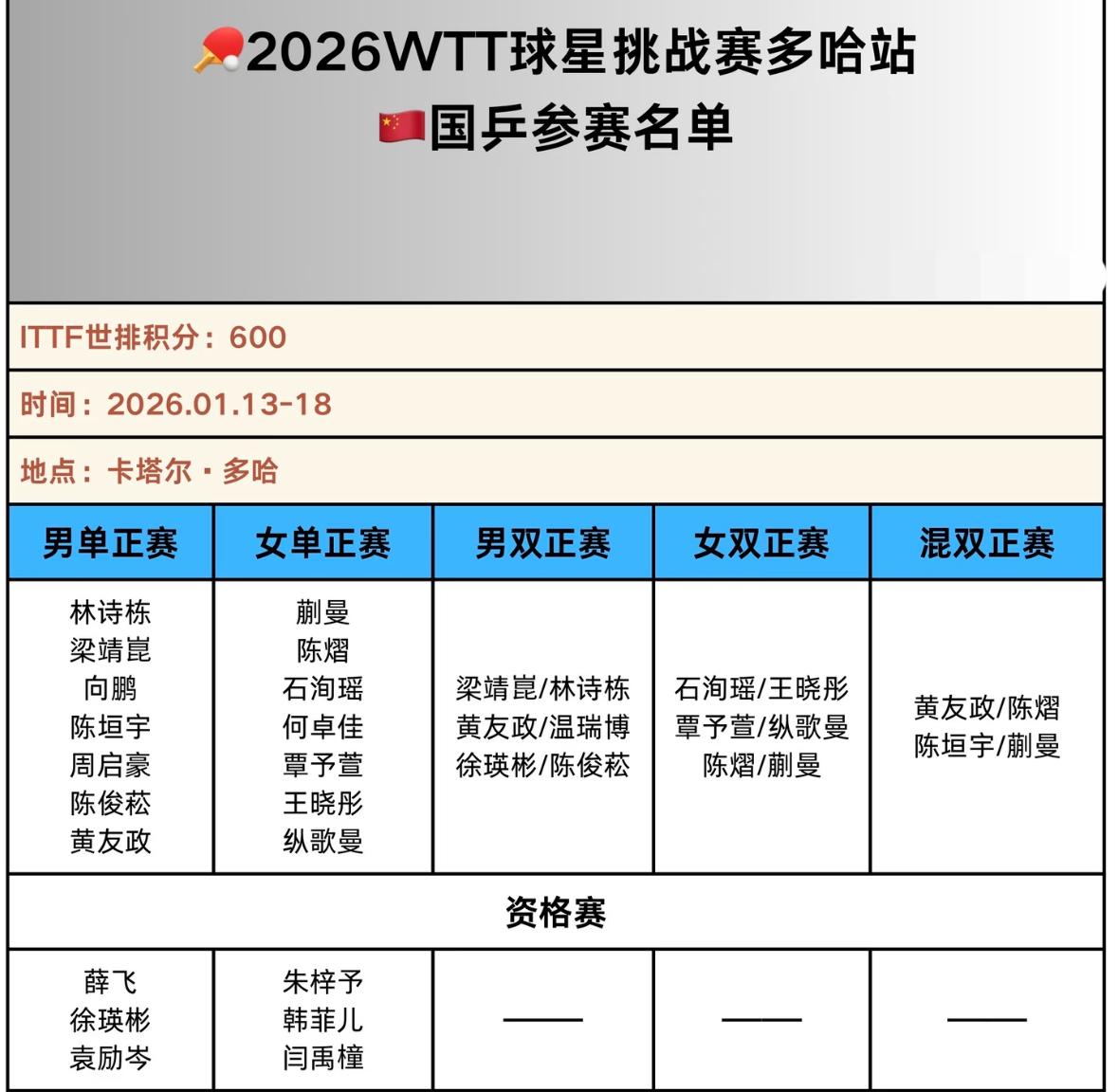 日乒多哈球星挑战赛参赛选手名单——张本智和 平野美宇参赛 多哈球星挑战赛在1月13日至18日, 举行,也就是在多哈冠军赛 后两天,不用转移地点, 又一次赛事! 日乒张本智和, 户上,筱塚大登,等都参加, 女队,大藤沙月,木原美悠平野美宇等都参赛! 张本智和为了尽快成为世界第一 也是玩命拼积分啊! 由于这次比赛和全日锦相隔很近, 张本美和与早田希娜都没有参赛, 平野美宇目前排名63, 能参加球星挑战赛已经非常不易, 这样的机会也不多, 这次球挑是因为前面有很多人没有 参赛,才延续到平野……. 国乒运动员林诗栋 梁靖崑 向鹏 陈垣宇 蒯曼 陈熠等领衔出战, 主力队员孙颖莎 王曼昱休息, 国乒加油, 林诗栋,梁靖崑为了积分也是拼了!