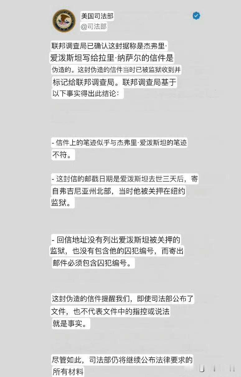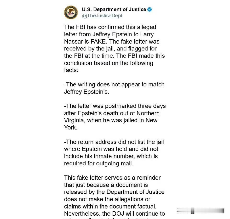 🚨 突发:民主党在整个 X 平台上针对特朗普和爱泼斯坦的重大假新闻行动被 DOJ 揭穿 自由派一直在发布一封所谓的“信件”,据称将特朗普牵连到爱泼斯坦的罪行中 DOJ:“这份笔迹似乎与杰弗里·爱泼斯坦的不符。这封信的邮戳显示是在爱泼斯坦去世三天后从北弗吉尼亚寄出,当时他被关押在纽约。” “回信地址没有列出关押爱泼斯坦的监狱,也没有包含他的囚犯编号,而这是寄出邮件所必需的。” 更多捏造。 民主党人对任何一个爱泼斯坦受害者都不关心两个屎。**那才是真相。** 机翻仅供参考