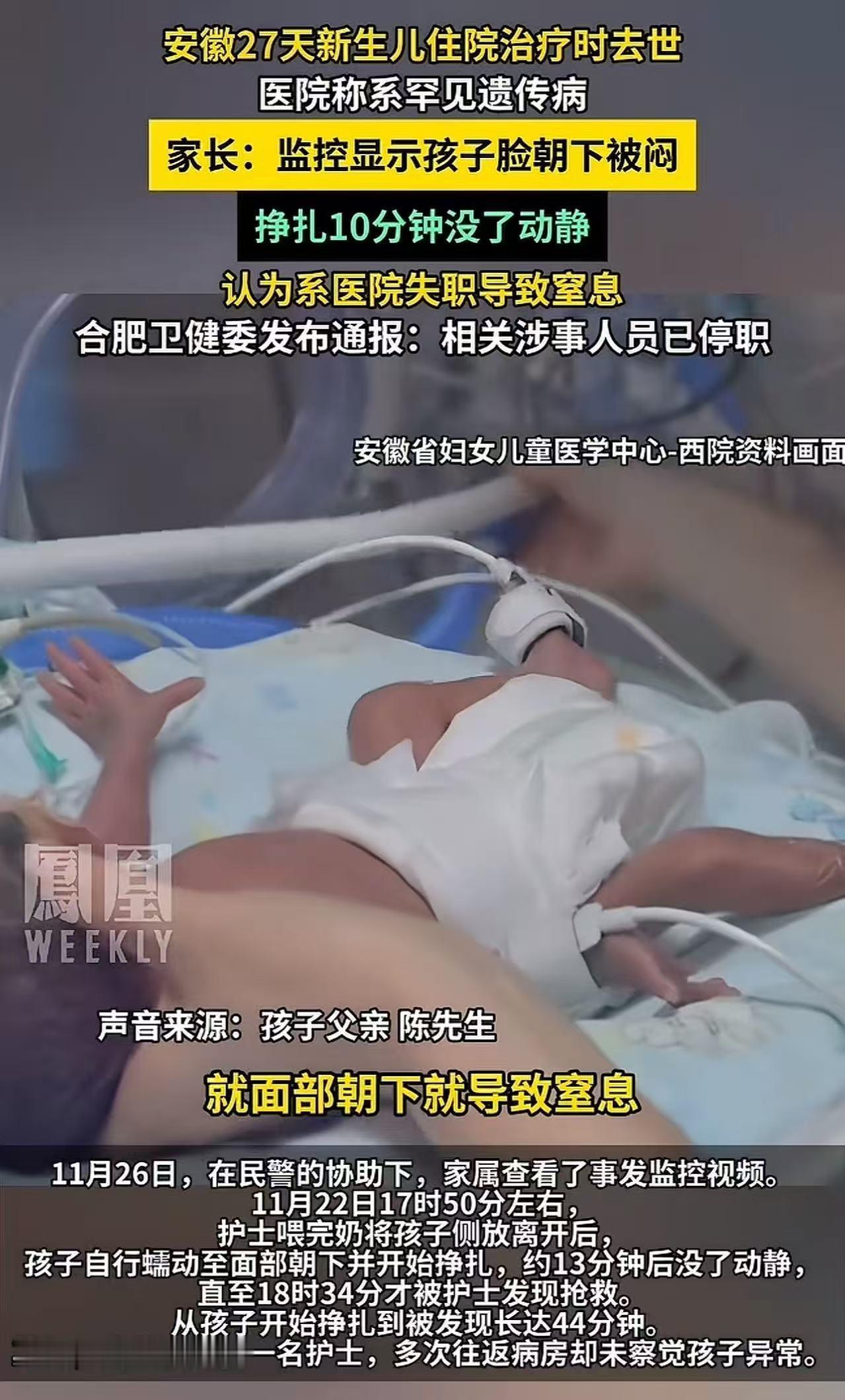 又一新生儿死亡!合肥,一新生儿黄疸住院治疗,结果突然死亡。家长查看监控后发现,孩子竟然脸朝下被闷在床上挣扎了10分钟,半小时后才被发现,医院一开始还想推卸责任称系遗传病致危!网友:孩子是来治病的,结果在医院丢了命,太让人痛心了! 陈先生和妻子好不容易熬过十月怀胎,盼来了这个孩子,可谁能想到,孩子出生才27天就走了。陈先生至今无法接受这个现实。 他回忆说,孩子是2025年10月27日在合肥市妇幼保健院西区剖宫产出生的。出生后黄疸一直没退,11月20日就送到新生儿科住院,接受蓝光治疗。 因为新生儿科是封闭管理,不让家属陪护,陈先生和妻子虽然心里不舍,但也只能遵守规定。 21号那天,护士打电话告诉陈先生,孩子一切正常,黄疸值虽然有点反弹,但不用太担心。陈先生听了稍微放心了些,想着过几天孩子就能健健康康地回家了。 可没想到,22号下午6点40分左右,医院突然来电话,说孩子突发肺出血,正在抢救。 陈先生吓得腿都软了,赶紧和妻子赶到医院,问医生到底是怎么回事。 医生解释说,孩子病情很罕见,血氨值很高,凝血功能差,血气检查结果也不理想。因为不清楚发病原因,只能根据监护情况来应对。 抢救期间,陈先生又被告知,孩子凝血功能太强,血液都没法检测了。 陈先生一听就懵了,之前医院还说孩子凝血功能差呢,怎么突然又变成太强了? 医生支支吾吾地说,原因很多,解释不清楚。随后,院方建议家属转院到安徽省儿童医院。 可是到了省儿童医院,孩子已经瞳孔放大,生命体征基本消失了。最终,孩子于11月24日宣告死亡,死因是呼吸循环衰竭。 悲痛之余,陈先生质问医院,孩子为什么会突然死亡? 医院却说,孩子是罕见遗传病导致的病危…… 陈先生不信这个说法。他说,孩子母亲产前检查都正常,产后孩子的足底血、串联质谱检查结果也都显示无异常。于是,他要求查看监控。 在民警的协助下,陈先生终于看到了监控画面。视频显示,11月22号17点50分左右,护士给孩子喂完85毫升奶后,把孩子侧放在床上,然后就离开了病房。 护士离开后,孩子自己蠕动到了面部朝下的姿势,开始挣扎。大约13分钟后,孩子没了动静。直到18点34分,护士才发现孩子异常,开始抢救。 从孩子开始挣扎到被发现,整整过去了44分钟!而且,病房里当时只有一名护士,她多次往返病房,却都没发现孩子的异常。 看到这一幕,陈先生又气愤又心痛。他认为,是医院的不负责任导致孩子病危。结合监控中孩子挣扎窒息的过程,他觉得孩子的死亡和窒息直接相关。 事发后,家属已经向合肥市卫生健康委投诉,并向辖区派出所报案。现在,事情还在进一步调查中。 医院,本应是守护生命的最后一道坚固防线,是患者及其家属在病痛与绝望中寄予厚望的“安全港湾”。然而,在这起事件中,医院却成了悲剧的“制造者”。 从监控画面中我们看到,孩子脸朝下挣扎,这不仅仅是简单的疏忽,而是对生命极度的漠视,是对医疗职责的严重亵渎。 每一个生命都无比珍贵,尤其是刚刚来到这个世界仅27天的婴儿,他们的脆弱与无助,本应得到医护人员更多的呵护与关注。可医院却让这样的悲剧发生,实在让人难以原谅。 更让人愤怒的是,医院在事件发生后的态度。面对家属的质疑,医院不是积极承担责任,查明真相,给家属一个合理的交代,而是试图推卸责任,将孩子病危归咎于罕见遗传病。 这种做法,不仅是对家属感情的二次伤害,更是对公众信任的肆意践踏。在医疗领域,信任是基石,一旦崩塌,将引发一系列严重的后果。 医院这种不负责任的行为,无疑会让患者及其家属对医疗行业产生深深的恐惧与不信任,进而影响整个社会的医疗秩序。 此外,医院护理日志、病例与监控视频时间节点多处不符,病历存在后补痕迹,这进一步暴露了医院管理的混乱与不规范。 病历是记录患者病情、诊断和治疗过程的重要文件,是医疗纠纷处理中的重要证据。如果病历都能随意篡改、后补,那么患者的权益又如何得到保障?医疗行业的公信力又将置于何地? 这起事件不能仅仅看作是一个个例,它反映出的是整个医疗行业在管理、监管等方面存在的深层次问题。 相关部门必须以此为契机,展开全面深入的调查,对涉事医院和相关责任人进行严肃处理,给家属一个公正的结果,给社会一个满意的交代。 同时,要加强对医疗行业的监管力度,完善相关法律法规,建立健全医疗质量监控体系,从制度层面杜绝类似事件的再次发生。 生命无价,每一个生命都值得被尊重、被呵护。我们不能让这样的悲剧一次次上演,不能让患者在医院里不仅要承受病痛的折磨,还要担心自身的安全!