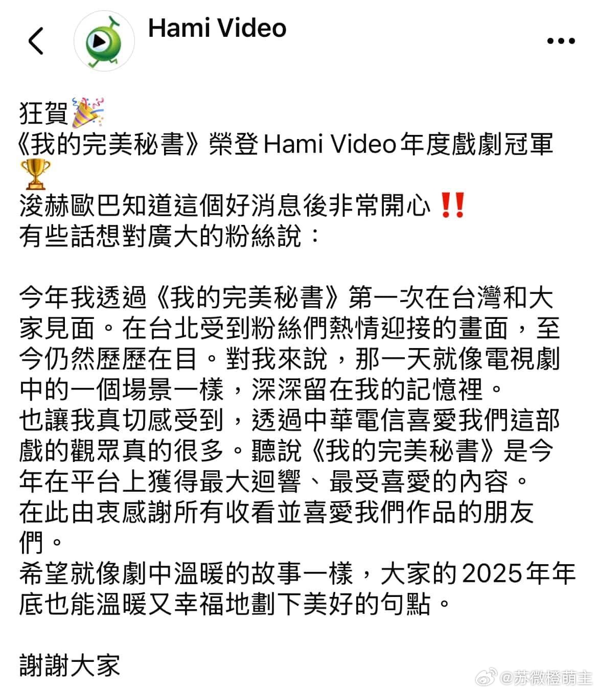 我的完美秘书荣登HamiVideo年度戏剧冠军完秘在台湾播的真的蛮好的