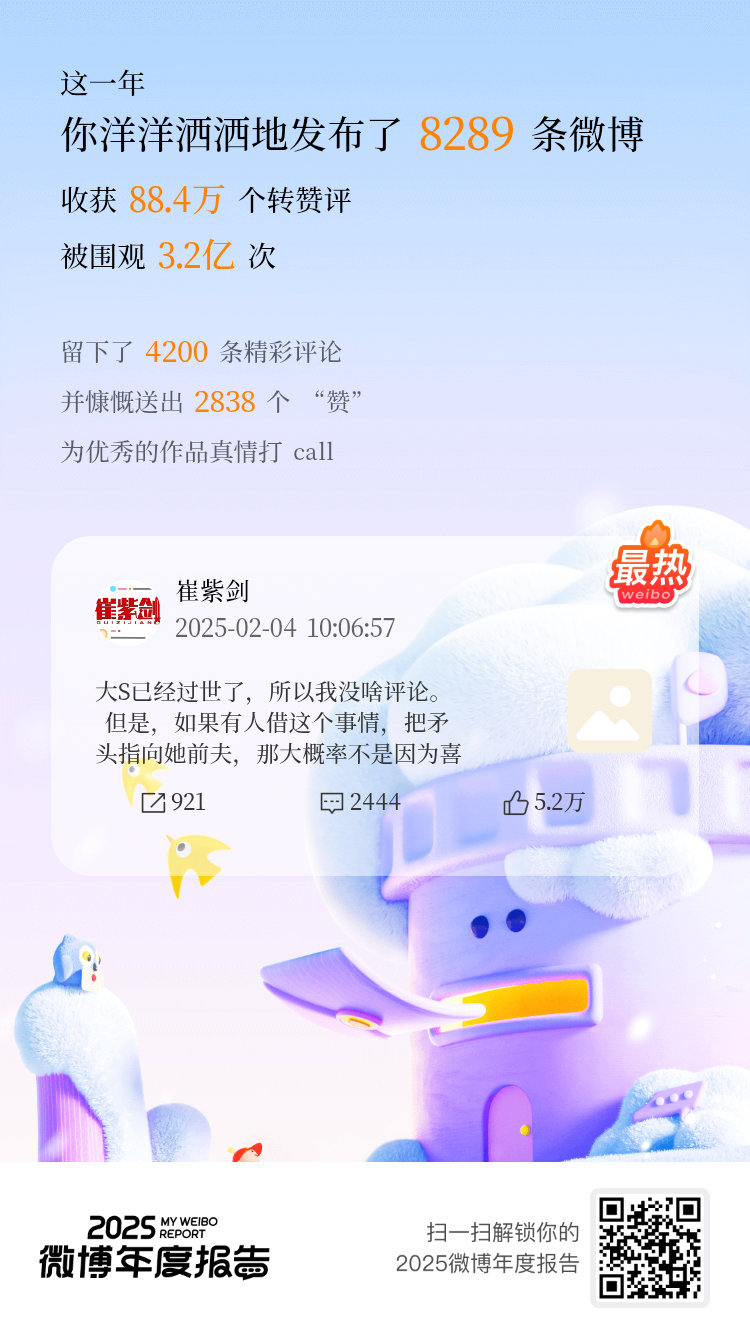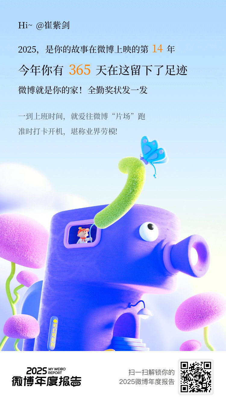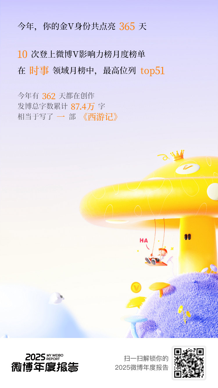 捷报喜报!2025我的V影响力力持续在线:金V成就闪耀365天 感谢家人们一路力挺!来看看你的年度总结吧~点击开启>>2025微博年度报告 微博年度报告微博之夜
