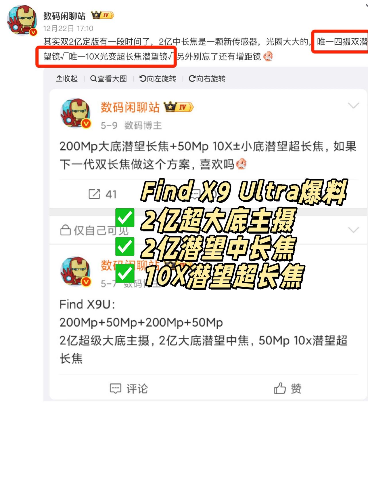 Find X9 Ultra你什么时候出? 咱就是说,今年的Ultra旗舰是妥妥的神仙打架啊👊 看了一圈爆料,2亿大底都快成标配了,吓人的很 🤔这里面我比较感兴趣的还属OPPO Find X9 Ultra 据说它要搞 “双2亿” ! 这和别家只有主摄2亿或者长焦2亿可不一样 听说是2亿超大底主摄+2亿像素潜望中长焦 这样从广角到远摄,画质都能顶满📸 而且主摄镜头进光量超1英寸,感光度估计也杠杠的! 我比较满意的是长焦这块还有一颗👉10X潜望超长焦,支持10倍光学变焦! 上一次让我震撼的三星S23 Ultra还是两年前呢。 这意味着拍演唱会、拍月亮、拍远景细节直接拉满 不用像其他没有超长焦的手机那样,只能数码裁切 其他家没这个焦段的话,望远能力肯定有差距 🌟这套配置,Find X9 Ultra三个镜头在1倍到10均能输出无损高质量焦段,20倍以内也是高画质,这组合想想就狠! 当然,小米17 Ultra、vivo X300 Ultra在影像这块也很顶 小米有徕卡2亿像素连续光学变焦 vivo用上2亿35mm定制光学主摄,可以说各有绝活🤔 👀不过说再好也没用,啥时候发啊。。。 旗舰手机国产手机OPPO Find X9 Ultra