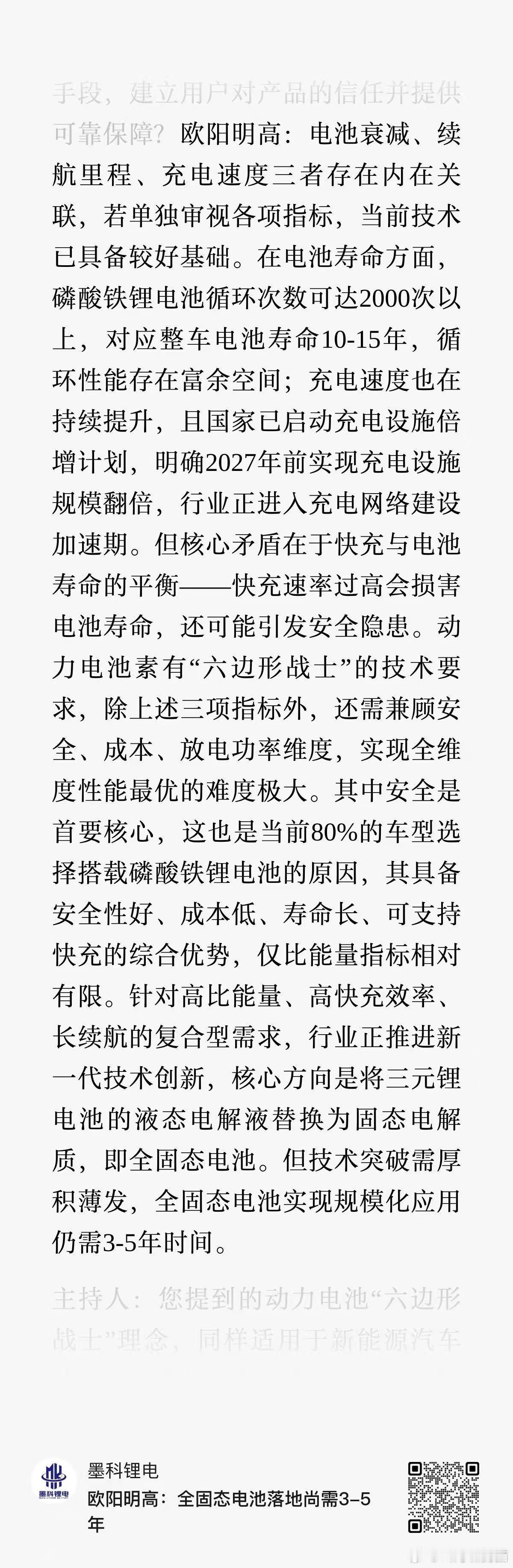 欧阳明高:电池衰减、续航里程、充电速度三者存在内在关联,若单独审视各项指标,当前技术已具备较好基础。在电池寿命方面,磷酸铁锂电池循环次数可达2000次以上,对应整车电池寿命10-15年,循环性能存在富余空间;充电速度也在持续提升,且国家已启动充电设施倍增计划,明确2027年前实现充电设施规模翻倍,行业正进入充电网络建设加速期。但核心矛盾在于快充与电池寿命的平衡——快充速率过高会损害电池寿命,还可能引发安全隐患。动力电池素有“六边形战士”的技术要求,除上述三项指标外,还需兼顾安全、成本、放电功率维度,实现全维度性能最优的难度极大。其中安全是首要核心,这也是当前80%的车型选择搭载磷酸铁锂电池的原因,其具备安全性好、成本低、寿命长、可支持快充的综合优势,仅比能量指标相对有限。针对高比能量、高快充效率、长续航的复合型需求,行业正推进新一代技术创新,核心方向是将三元锂电池的液态电解液替换为固态电解质,即全固态电池。但技术突破需厚积薄发,全固态电池实现规模化应用仍需3-5年时间。