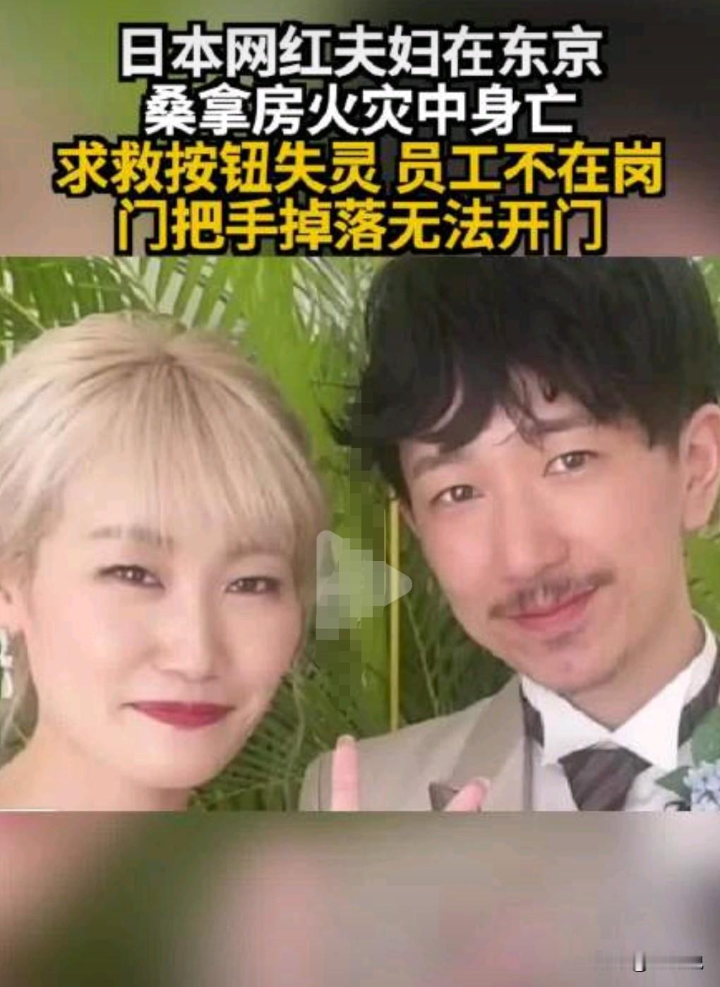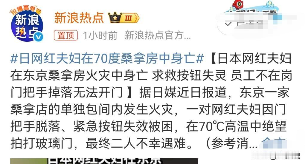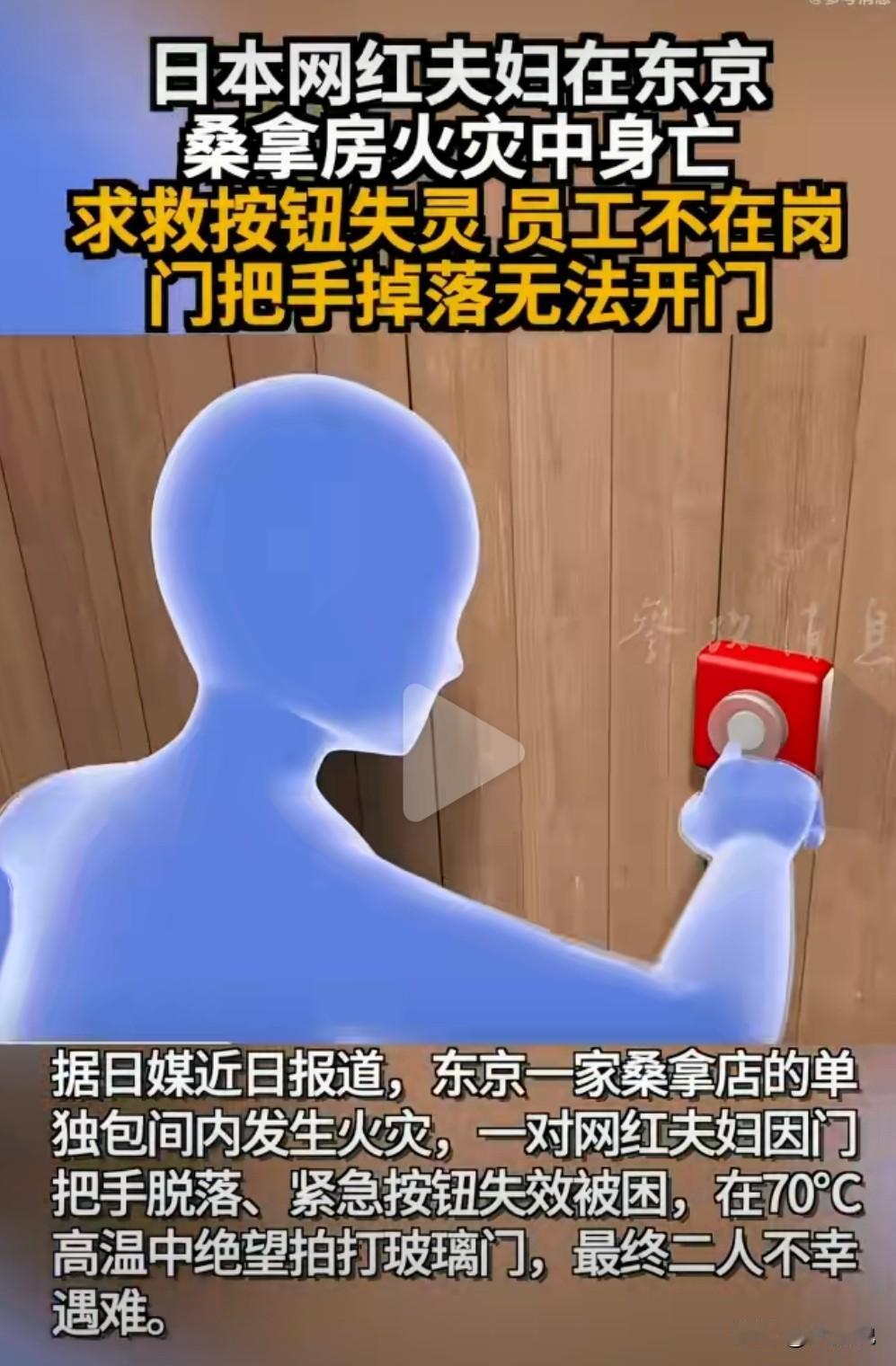 这真的是太惨了,活活被烫死。 据日媒近日报道。 日网红夫妇在70度桑拿房中身亡。 70度,那真的是太可怕了。活活被烫死。 这商家问题很大呀,求救按钮失灵,员工还不在岗,就连门把手都掉落了,因此无法开门。 这种种问题真的是太倒霉了,竟然让这对网红给碰上了。 当时在绝望中拍打玻璃门。 看来应该是踹不开。