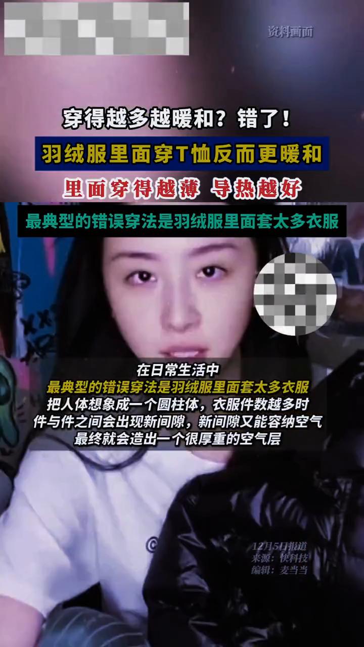 穿得越多越暖和?错了!羽绒服里面穿T恤反而更暖和,里面穿得越薄导热越好。 最典型的错误穿法是羽绒服里面套太多衣服。一到冬天,羽绒服就成了大多数人的出行标配,怕冷的人就恨不得把家里的所有衣服都套身上。但事实上,少穿点反而更保暖。 因为羽绒服的原理是把人当作圆柱体来看,羽绒服是保暖层,秋衣则是导热层,越薄导热越好,就像在被窝里裸睡反而更温暖的道理一样。 在日常生活中,把人体想象成一个圆柱体,衣服件数越多时,件与件之间会出现新间隙,新间隙又能容纳空气,最终就会造出一个很厚重的空气层。空气层太厚重,里面的空气将不再静止而是会流动起来,这就是热对流。根据传热学理论,热对流会加剧热量散失,并且冷流汇入暖流,辛辛苦苦攒的热量都被浇灭了。