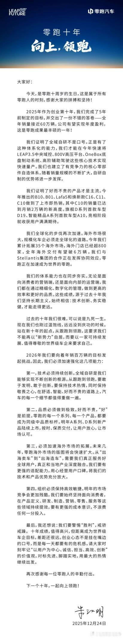 零跑汽车十周年CEO朱江明发了封全员信。他表明,零跑不能再以“新势力”自居,而要以一家可持续发展、值得尊敬的世界级车企来要求自己最重要的也说了:警惕“胜利”,戒骄戒躁。关于26年的目标,是年销百万。作为参考,今年全年零跑销量是近 60万辆,你觉得零跑可以做到吗?零跑汽车零跑