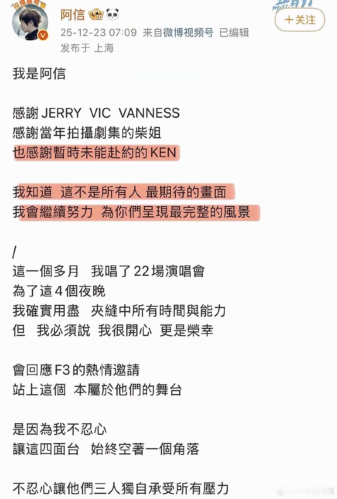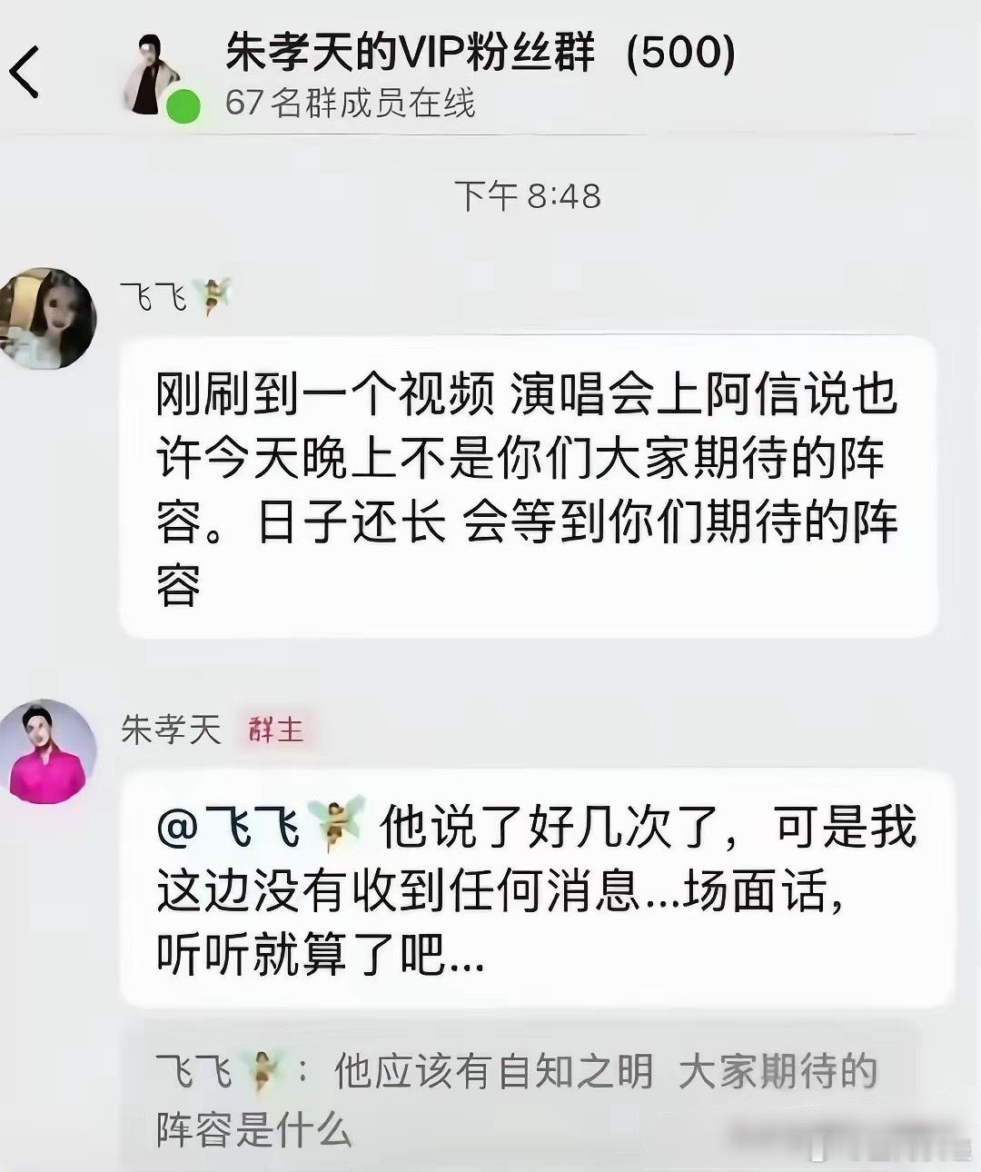 朱孝天回应缺席F4朱孝天缺席F4合体引发的争议持续发酵,他在粉丝群称阿信的感谢是“场面话”,还控诉被主办方单方面切断联系、抹黑;而主办方则表示其屡次泄露机密信息被视为“不可控因素”除名,柴智屏也佐证其性格“不大世故”。有网友还将其性格类比安陵容,感慨自卑与自大的交织让矛盾更显复杂。看过朱孝天参加综艺节目的视频,说话很直接,可能不太顾及别人的感受,貌似并不在意别人的看法。这场罗生门你怎么看?朱孝天 朱孝天回应缺席f4