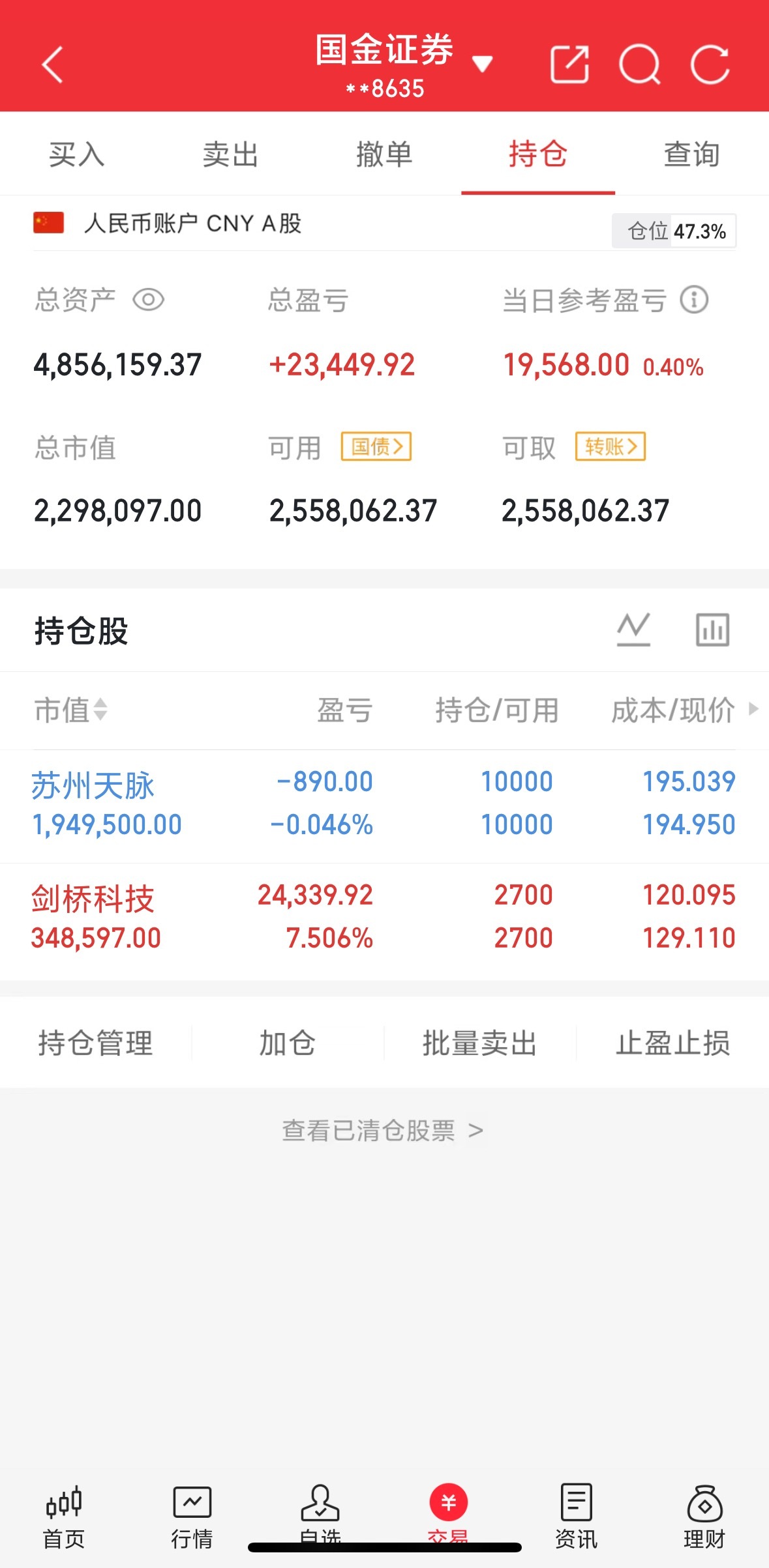 200w本金,目标1年做到1000w,1年翻五倍,欢迎各位关注验证!(第116天)今天买入:今天卖出:继续持有:剑桥、苏天继续看好,明天冲高在走感谢大家的支持与互动,点赞富一生,评论666股市一路长虹特别声明:这只是我个人的操作记录,不作为任何投资建议,更不是劝你们跟买! 股市有风险,投资需谨慎!股票投资今日股市