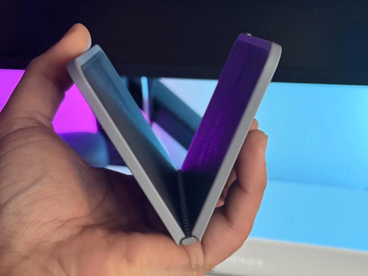 iPhoneFold机模出炉图一到图三是网友用 3D 打印做的 iPhone Fold 模型,外屏尺寸约 5.4 英寸,内屏尺寸 7.6 英寸,展开厚度 4.8mm,折叠厚度 9.6mm,矮胖矮胖的,手感这方面感觉可以参考华为 Pura X。不过我最好奇的点还是:这机子到底是不是无折痕设计?