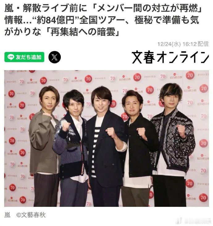 文春曝岚成员内讧 据文春,岚将于3月至5月间举办解散演唱会,但部分成员因忙于个人事业,五人全员到齐的日子屈指可数。最令人担忧的是,团体暂停活动前就已出现的成员间对立情绪,如今正再度升温。但即便在团体活动暂停期间,仅凭粉丝俱乐部会费,每年也能获得约20亿日元(约9千万元)的收入。