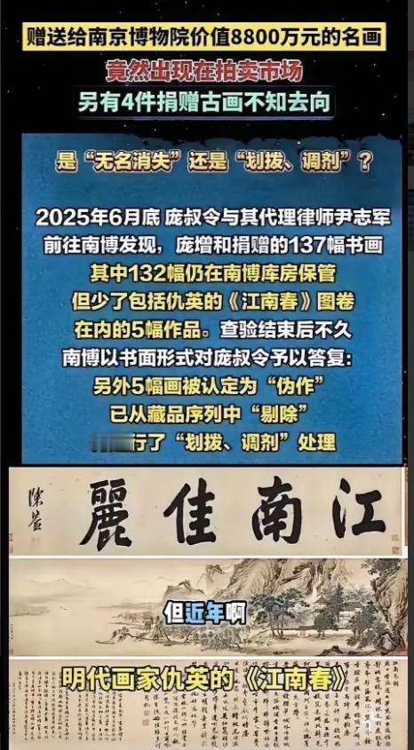 闹大!南京博物院事件升级:退休员工联合42人实名举报,官方介入。 南京博物院这场横跨六十余年的文物风波,远比公众想象的复杂。 一切始于1959年,收藏家庞增和的137幅捐赠,其中明代仇英《江南春》图卷,在2025年以8800万估价现身拍场,像根导火索引爆了沉积的暗雷。 捐赠者后人发现,当年5幅“伪作”处置记录模糊,而《江南春》从南博库房到拍卖行的流转轨迹,撕开了文物管理的多重裂缝。 关键转折点,在退休职工郭礼典的实名举报。这位69岁的前典藏部员工,手持08006号工作证和42人联名材料,直指前院长徐湖平的“六宗罪”。 最核心的证据,是1997年的文物调拨单:时任南博副院长的徐湖平,同时以江苏省文物总店法定代表人身份签字接收《江南春》,将其标注为《仿仇英山水卷》。 这种“左手批、右手接”的操作,直接违背文物流转的利益回避原则。 更蹊跷的是,2001年该画以6800元卖给“顾客”,买家栏空白的销售记录,与徐湖平之子在上海的拍卖行形成闭环。 二十年后8800万的估价,暗示着一条“鉴伪-贱卖-洗白-高价回流”的黑色链条。 争议的核心在于“伪作”鉴定的公信力。1961年张珩、谢稚柳等专家的“伪作”结论,与2025年拍卖市场的天价形成刺眼反差。 业内人士指出,庞莱臣旧藏的仇英作品多被公认为真迹,且《江南春》的递藏记录清晰,历代题跋俱全。 南博至今未公开完整鉴定报告,仅以“马赛克文件”回应,加剧了“人为干预鉴定”的猜测。 更关键的是,根据1990年代《博物馆藏品管理办法》,处置捐赠品需通知捐赠人,而庞家直到2024年诉讼才知晓画作流向,这种长达半个世纪的隐瞒,直接动摇了公益捐赠的信任基础。 故宫南迁文物的封存问题,让事件升级为系统性危机。 郭礼典披露,徐湖平任内擅自启封,朝天宫地下库房的2211箱南迁文物,这些带着抗战封条的国宝,被指通过“鉴定伪作-内部调拨-海外拍卖”的模式流失。 2008年首次联名举报材料显示,四十余职工早已知情,却因“保护伞”阻挠未能查处。 直到2025年舆论发酵,国家文物局工作组进驻,才让十万余件南迁文物的清点成为可能——每一件缺失,都是不可逆的文化损失。 程序漏洞在事件中暴露无遗。1997年江苏省文化厅的“调剂批复”,未要求公示捐赠人;2001年的“顾客”销售记录,违反文物交易实名制度;拍卖前的文物审核,也未追溯《江南春》的来源合法性。 更讽刺的是,徐湖平退休后家中的黄花梨家具、宋代钧窑等疑似珍贵文物,与“清贫院长”人设形成反差,加剧了“监守自盗”的质疑。 而南博早期“无可奉告”的态度,纪检与文旅部门的推诿,让公众看到监管体系的失灵。 这场风波的本质,是公共文博机构对“信任契约”的破坏。 庞家后人的诉讼、郭礼典的举报、42人的联名,都指向同一个疑问:当捐赠的文物被随意处置,当鉴定成为牟利工具,当库房钥匙沦为私权,文化遗产的保护如何取信于民? 国家文物局的介入、江苏多部门联合调查,虽让真相有望浮出水面,但更深层的制度改革迫在眉睫。 捐赠品追踪系统、第三方鉴定机制、跨部门监管合力,这些才是防止“下一个徐湖平”的关键。 文物不是数字,是民族记忆的载体。《江南春》的真伪之争,最终要回到对历史的敬畏、对程序的尊重。 当82岁的徐湖平晒出病历来回应举报,当郭礼典们用职业生涯赌一个真相,这场风波早已超越个人是非,成为检验文物保护体系的试金石。 公众等待的,不仅是某个人的追责,更是一个不再让善意蒙尘、让国宝流浪的制度性答案。