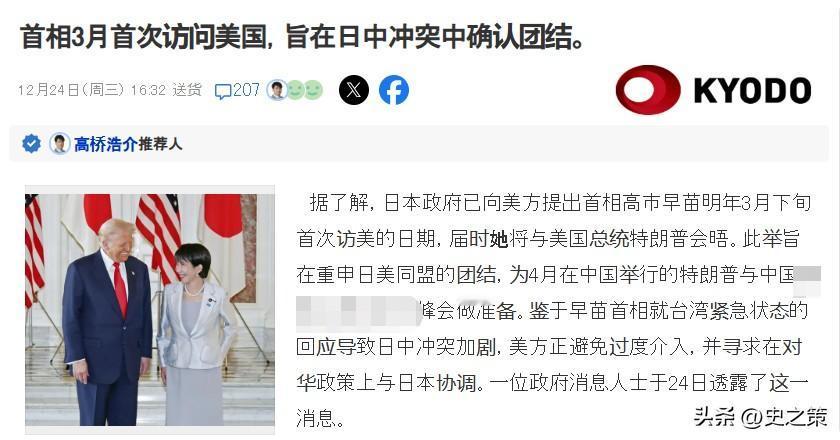 【赶在特朗普访华前,高市早苗想先去美国一趟,并考虑了3个时间节点供选择。】一个是26年1月,一个是26年3月,还有一个是26年4月甚至是更晚。 12月24日,日本政府消息人士透露,日方已经向美方提出了高市早苗明年3月份下旬访问美国的计划。届时,高市早苗将会在美国和特朗普举行会晤。日方称,此举是为了在重申美日同盟团结的同时,为4月份可能进行的中美峰会做准备。 自高市早苗发表错误涉台言论以来,日本一直忧心忡忡,不是担心言论惹怒了中国,而是迟迟等不来美国的明确表态。目前,不管是特朗普本人,亦或是美国国务卿等美方高层,都在极力避免介入此轮中日摩擦中。 这在日本看来,是极其危险的信号。所以,高市早苗一直希望能尽快和特朗普见面,并当面听听特朗普的想法。目前,共选择了三个时间节点,如开文所说:明年1月、3月和“4月乃至更晚”。 这三个时间点并不是随便选的,分别代表着不同的含义。 首先,1月的时间节点指的是1月23日前,即日本召开例行国会前的某天。因为此次国会将审议2026财年预算案,其中,日本2026 财年防卫预算高达 9 万亿日元,且不少预算案就是用于采购美式装备、升级驻日美军基地和美日同盟训练等。所以,高市早苗明显是想以此为筹码和特朗普会见。 其次,3月份的时间节点对应的是预算案通过以后,特朗普访华之前。若高市早苗若此时访美,既可以拿着通过后的防卫预算,和特朗普就防卫费使用、联合演训、装备采购、供应链合作等议题展开深度磋商,还能避免美国对华互动中降低日本的优先级。 最后,4月份的时间节点是特朗普访华之后,这也是日方最不想选的一个时间点。因为一旦选择这个节点赴美,无异于说明特朗普在3月份拒见高市早苗。此举明摆着告诉日本,你们的优先级远在中国之后。但是,高市早苗又不得不去,因为她需要探听美方的口风,看看特朗普对中日是什么看法。 所以,综上来看,日本最希望的时间点是在明年1月份或3月份。不过目前来看,1月份的计划要泡汤了。根据日媒的报道,美日就1月23日前访美的计划并未达成一致。不过,日本国内也有人提出,日美双方能否在1月份的瑞士达沃斯世界经济论坛年会期间举行日美峰会呢? 1月19日至23日,达沃斯世界经济论坛年会将在瑞士举行,特朗普计划率团出席。因此,双方的确可以在年会期间举行场边峰会。然而,高市早苗身边的人更希望能够举行双边峰会,以留出更多的时间讨论经济、安全在内的多项合作。 除了这方面的考虑以外,1月23日还是日本国会的召开日,时间上也错不开。所以,日本国内分析指出,高市早苗基本不可能在1月份见到特朗普。因此,日方才向美方提出了3月份会见的想法。 接下来,就要看特朗普给不给高市早苗面子了。给的话,3月份能见。不给的话,别说4月份了,甚至更晚也不是没有可能。