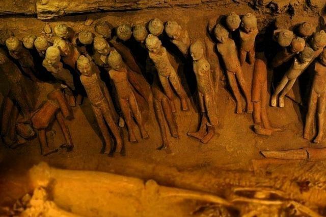 你以为古代殉葬的人,被封进墓穴后就坐着等死,实际上他们为了活下去会尝试所有办法,考古发现太多反抗的痕迹了。 漆黑墓穴里空气越来越稀薄,那些被选作陪葬的人难道就安静躺着认命?考古现场挖出的骨头伤痕告诉你,他们拼了命想活下去,反抗痕迹到处都是,让人脊背发凉。 被封进墓后的求生极限,有人根据墓室空间和人数算过氧气消耗。如果人数少于18,空气够三天;50人左右只剩一天;超过56,几小时就缺氧窒息。 《吴越春秋》记载吴王阖闾女儿死后,用白鹤诱大批民众进墓道,然后封门。士兵在外听哭喊,第一天声音大,第二天弱,第三天断续,第四天没动静。起初人们有劲儿挣扎,后来缺氧无力。 阖闾这事儿是为了让女儿在阴间不孤单,但实际残酷,民众被骗进去后没法逃。殷墟祭祀坑人骨有挣扎痕迹,部分个体骨折显示试图反抗。封墓后陪葬者可能抢祭品食物,争抢引发打斗,骨上伤痕不全是入墓时造成的。 部分骨骼咬痕,一种是啃牲畜骨,另一种更极端,转向同伴。商朝人祭方式多样,砍头焚烧活埋都有,甲骨文记录一次杀数百。受害者多外族,青铜甗内蒸煮人头骨常见。整个制度背后是灵魂不灭信念,权贵觉得死后还需伺候,就拖人下去。 周朝后渐少,但边疆民族如辽金元还保留,辽太祖死后皇后强迫上百大臣殉葬,金代女真贵族不用棺但要殉人。元朝蒙古贵族也用人殉,影响深远。 制度演变是个长过程,从商周盛行到秦汉衰落。秦始皇用陶俑代替活人,汉代偶见殉人多为私奴婢。战国以来木俑陶俑流行,这是奴隶地位提高和斗争结果,社会进步。明朝朱元璋复行殉葬,他死时46妃嫔陪葬,有人试图逃脱但失败。 明英宗下诏废止后宫殉葬,成为法令形式首例。康熙彻底终结帝王活人殉葬,野蛮习惯到17世纪才停。