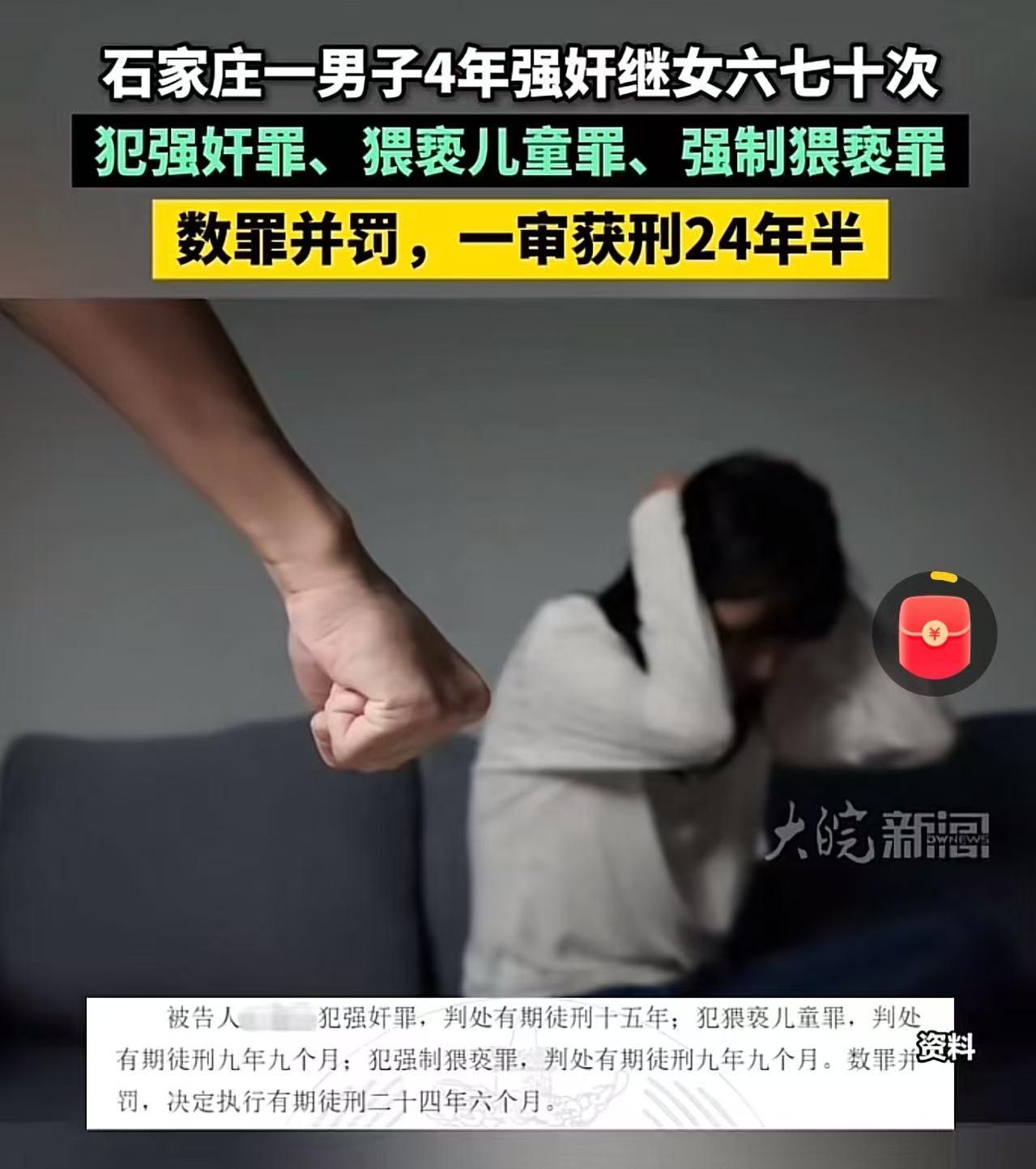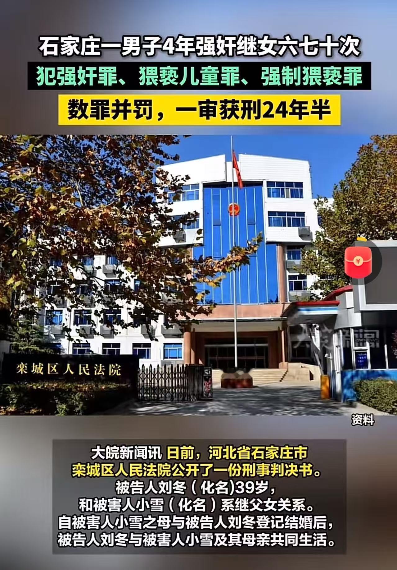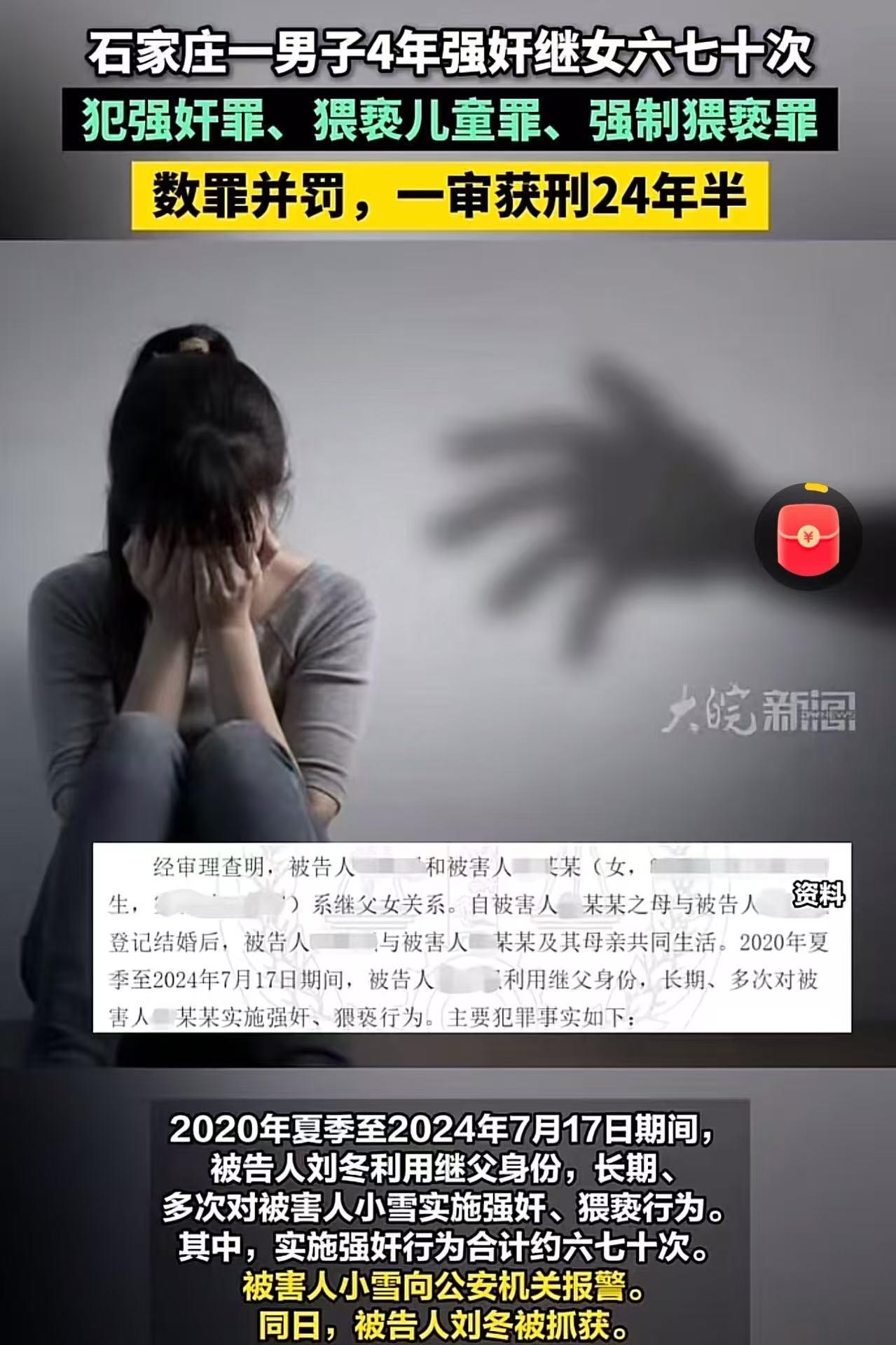“这简直是泯灭人性!”石家庄,一名男子竟然在长达4年的时间里,对年幼的继女实施了六七十次强奸,一审被判刑24年半,可网友们却纷纷怒吼:这种继父直接判死刑都不为过,简直连畜牲都不如,连自己的继女都下得去手! 被告人刘冬,39岁,和被害人小雪(化名,2009年出生)是继父女关系。 小雪才两周半的时候,母亲就和刘冬携手步入了婚姻殿堂。婚后,母亲又为刘冬生育了一女一儿,小雪也一直跟着母亲生活。 平日里,刘冬表面上对小雪也还算不错,会给她买些零食玩具,偶尔还会带她出去玩。 小雪年纪小,又单纯,从未对母亲说过任何关于刘冬不好的事情。所以,小雪母亲怎么也没想到,这个看似“和善”的丈夫,竟会对自己的亲生女儿做出如此禽兽不如的事。 从2020年那个炎热的夏季开始,一直到2024年7月17日,这长达4年多的时间里,刘冬利用自己继父的身份,如同一个恶魔一般,长期、多次对年幼的小雪实施强奸、猥亵行为。其中,强奸行为就多达六七十次,每一次都是对小雪身心无尽的摧残。 2024年7月17日,这个让小雪刻骨铭心的日子,她终于鼓起勇气,向公安机关报了警。 原来,这么多年来,小雪并非没有反抗过。每当刘冬对她实施侵害时,她都会拼命挣扎,试图挣脱那双罪恶的手,可她毕竟只是个孩子,力量太过弱小,根本无法反抗成功。 而且,刘冬还恶狠狠地威胁她,如果敢把这件事告诉其他人,就会休了她的母亲,让她回到老家,自生自灭。 小雪害怕母亲受到伤害,也害怕自己真的会被抛弃,所以一直忍气吞声,没有报警。直到后来,她渐渐长大,也懂了一些法律知识,知道刘冬的这种行为是严重违法的,这才鼓起勇气,选择了报警。 而被告人刘冬在供述时,竟然还大言不惭地说,之所以强奸小雪,仅仅是因为小雪不是他亲生的,而且他还天真地认为,强奸她之后她不会报警。这种扭曲、变态的心理,简直让人毛骨悚然。 法院经过审理认为,被告人刘冬利用与被害人小雪有共同家庭生活关系的便利,在与小雪共同生活期间,完全不顾小雪的意愿,长期、多次与她发生性关系;为了满足自己那扭曲的刺激欲望,在明知小雪未满十四周岁的情况下,还长期、多次对她实施猥亵行为;甚至为了寻求刺激,长期、多次以胁迫等恶劣手段强制猥亵小雪,情节极其恶劣。刘冬的这些行为,分别构成了强奸罪、猥亵儿童罪、强制猥亵罪,数罪并罚,最终决定执行有期徒刑二十四年六个月。 现在这个家散了,小雪母亲最难受,强奸犯是自己的丈夫,是自己两个孩子的父亲,她不知道该怎么面对这一切,也不知道该怎么让小雪从这阴影当中走出来! 此事引发热议,有网友说,双方离了婚,不管是男孩还是女孩一定要跟着父亲,女人会再嫁 还会有孩子,只有父亲才是最亲的人,必定血浓于。 也有网友说,应该判死刑才对,真的不是人,我也是二婚,我老婆带女嫁我,每次她女儿单独和我在一起的时候,我马上让她去找她妈妈,我怕别人看见不好,只要女儿想要什么我从不反对,女儿经常对我说我比她亲爹都好,我也跟女儿说你就是我亲生的,但是你就是不能和我单独在一起! 还有网友说,妈妈真的不知情吗?她真的爱小雪吗?是妈妈没发现,这个孩子能忍四年不跟妈妈说?太离谱了! 在我看来,法律对刘冬的惩处虽重,但相较于他所犯下的罪行,似乎仍不足以平民愤。 刘冬利用继父的身份,将罪恶的黑手伸向了年幼的继女,给小雪带来了无法磨灭的心理创伤,这种行为简直是对人性、对道德、对法律的公然践踏。 对于这种丧心病狂的罪犯,仅仅24年半的刑期,难以真正起到震慑作用。我们必须深刻反思,如何才能更好地保护未成年人的权益,如何才能让这样的悲剧不再上演。 同时,对于此类严重侵害未成年人的犯罪,法律是否应该进一步加重惩处力度,让犯罪者付出更惨痛的代价,才能真正彰显法律的威严,给受害者一个真正的交代。 (来源:大皖新闻)