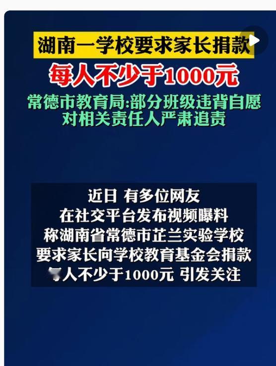 湖南学校的捐款通知有点扎心, 不信你看家长群里的消息, 底线1000元的自愿像道坎。 家长群突然发通知说教育基金会要捐款,每人至少1000元,家庭条件好的多捐,数字带985、211寓意好,听着像建议,可底线标得明明白白。教育局很快介入,说这是公告措辞不当,不是强制,已经叫停还让退钱,可家长们心里多少有点堵,自愿俩字咋就说得这么模糊。 学校想给孩子更好的条件能理解,可标着底线的自愿,真的能让家长不犯难吗?