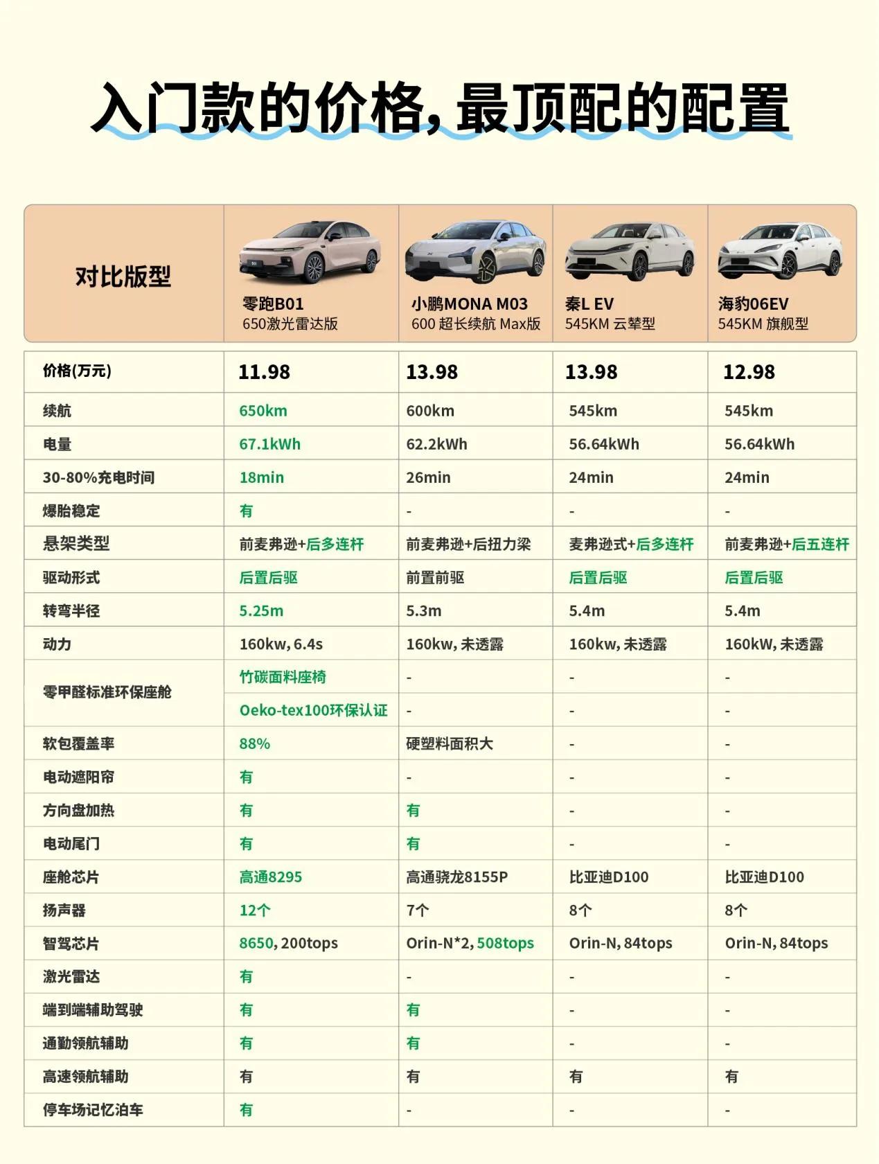 紧凑级家轿三选一,你会怎么选? 大多数朋友在选择10万级紧凑级家用轿车时,都会将智能化和续航当做购车的核心因素,而零跑B01、秦L EV和海豹06EV都是该级别的热门车型,面对三选一的问题,哪款车才是最优选呢? 先来看智能化,秦L EV采用778G芯片,海豹06EV采用D100芯片,辅助驾驶都是没有激光雷达的视觉方案,这也是同级主流配置。而零跑B01却带来了8295芯片+双AI语音大模型智舱,以及8650+激光雷达+组合辅助驾驶系统,越级的硬件不仅有更多功能,而且车机交互和辅助驾驶体验更越级,更安全。 在续航层面,秦L EV和海豹06EV续航均为545km,快充24min;零跑B01续航650km,快充仅18min,这意味着,城市代步半个月充电一次就行,长途远行的里程焦虑可以彻底打消。 更关键的是,零跑B01顶配仅售11.98万元,价格上也在上述的三款车型里优势最明显,配置、价格都更有诚意,因此我建议趁着购置税退坡还没来,大家抓紧时间做决定。而且现在下定B01还能享电池终身免费质保和至高价值17800元权益,机不可失。
